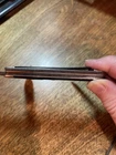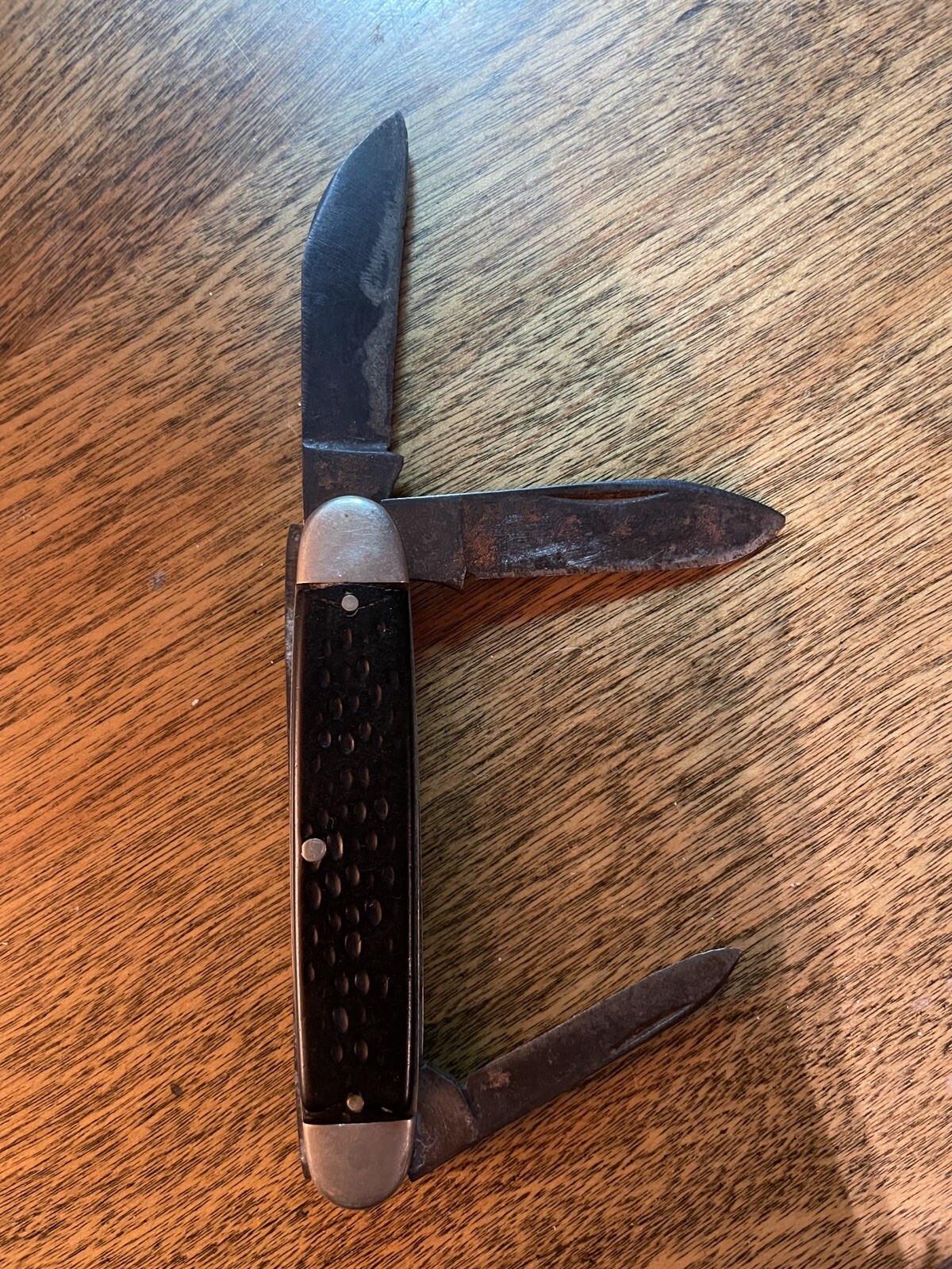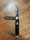 This Vintage pocketknife manufactured for Montgomery Ward by Utica Cutlery was crafted in the United States with carbon steel blades. This ambidextrous knife features a slipjoint lock and a black bone handle with a Rogers Jigged design. It has three blade types: drop point, pen, and spear point, and is an original piece from 1872-1950. The knife is 3-3/8" closed. The knife is "as is" condition. Please refer to pictures to see accurate condition.