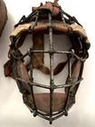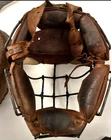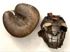 This vintage baseball equipment display features a Spalding glove, mitt, and catcher's mask from the early 1900s. The items are in their original state and were made in the United States. They are perfect for collectors and enthusiasts of vintage sports memorabilia. The brand of the equipment is Spalding, and it is from an era when baseball was played with great enthusiasm in the United States. The items are suitable for display in a sports museum or as a unique addition to a collection. This is a rare opportunity to own a piece of history and showcase your love for the game.