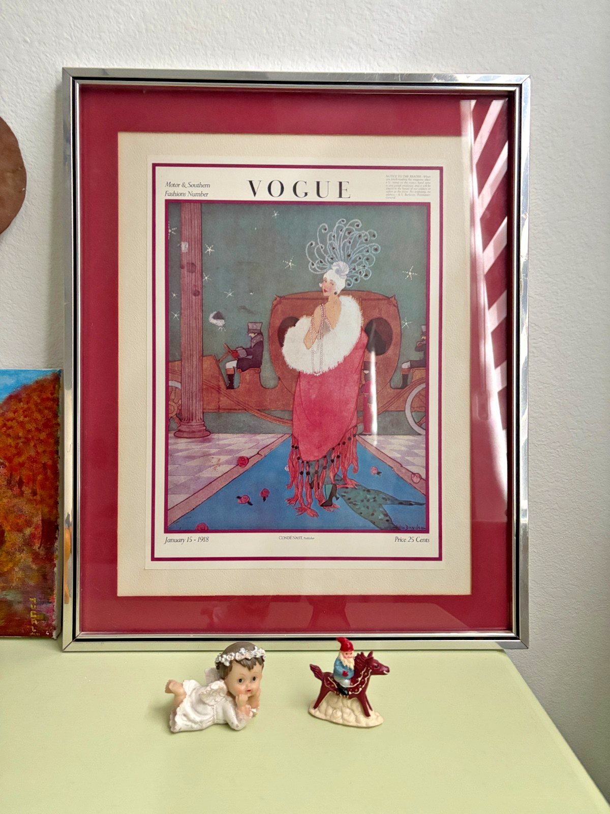 This authentic January 15, 1918 Vogue Magazine cover , illustrated by renowned Art Deco artist Helen Dryden , is a striking portrayal of early 20th-century glamour and Southern elegance. Featuring a poised woman adorned in a luxurious red evening gown, fur stole, and elaborate feathered headpiece, this artwork captures the sophistication and opulence of post-Edwardian fashion . The vintage illustration showcases a richly colored horse-drawn carriage scene, emblematic of 1910s Southern high society and the golden age of American illustration. Beautifully laminated for durability and preservation, this piece is ideal for: Vintage fashion and magazine collectors Art Deco or historical art lovers Interior decor enthusiasts seeking a touch of antique charm Gift ideas for vintage style aficionados Celebrate the legacy of Conde Nast publications , classic Vogue covers , and the glamorous world of 1910s women’s fashion with this timeless collectible. A rare and elegant addition to any collection or gallery wall.