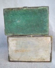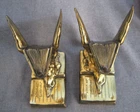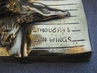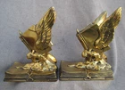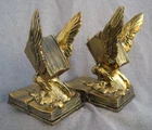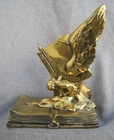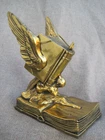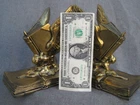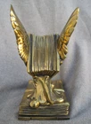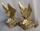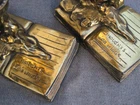 Offered here are a pair of HEAVY metal bookends. I THINK they are brass. (Or at least have a brass surface plate.) Each features a book with wings. The tip of a feather quill pen is protruding from the flying book. The base is another book, and is marked, "THOUGHTS ON WINGS." The bottom / back of the base is embossed, "Copyright JB 1473." (This mark is a bit hard to see.) Online, I saw another example of these that the seller had described as being made by "Jennings Brothers circa 1925," but I admit that I don't know for certain. (I'm counting on the BUYER to know what they are bidding on.) The base on each measures 5 & 1/4 inches long, by 3 & 1/4 inches wide. They are 6 & 1/2 inches tall at thew tips of the wings. They are in overall GOOD condition. The brass surface finish is mostly very nice & glossy. Look hard enough, and you see some small scattered "blemishes" - but nothing too serious. THE GREEN FELT IS MISSING FROM THE UNDERSIDE OF ONE BOOKEND. The set displays very nicely , and they are guaranteed to be old & original, or your money back. They are VERY heavy (The combined weight is almost seven pounds.) They will ship USPS in a "Large Flat Rate Priority Mail" box at a cost of $22.00. I AM HERE TO HELP WITH QUESTIONS .. WE stand behind all of our merchandise and we believe in treating our customers like we want to be treated! If for any reason you are not happy with your purchase, send it back and we will be happy to refund your money ! High bidder pays $22.00 for USPS Priority Mail with delivery confirmation in the U.S. US SHIPPING ONLY Payments must be received within 3 days of auctions ending date. MONEY BACK GUARANTEE !! HAVE A GREAT DAY !!