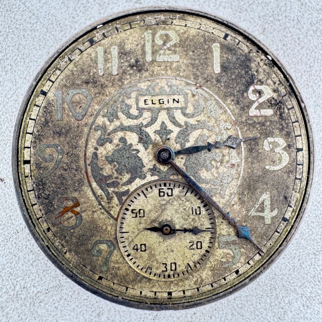 Vintage 12s 1928 Elgin Floral 17 Jewel Mechanical Pocket Watch Movement 345 USA Product Description Item: Pocket Watch Movement Brand: Elgin Model: Floral Movement: Mechanical Production Year: 1928 Country: USA Jewels: 17 Jewel Gender: Men's Grade: 345 Size: 12s Product Measurements Diameter: 39.5mm Product Condition Overall Condition: Poor, overall condition for its age. Functions: Not running, the Balance staff is broken. Dial: The dial is in rough condition. Hands: There is discoloration on the hands.