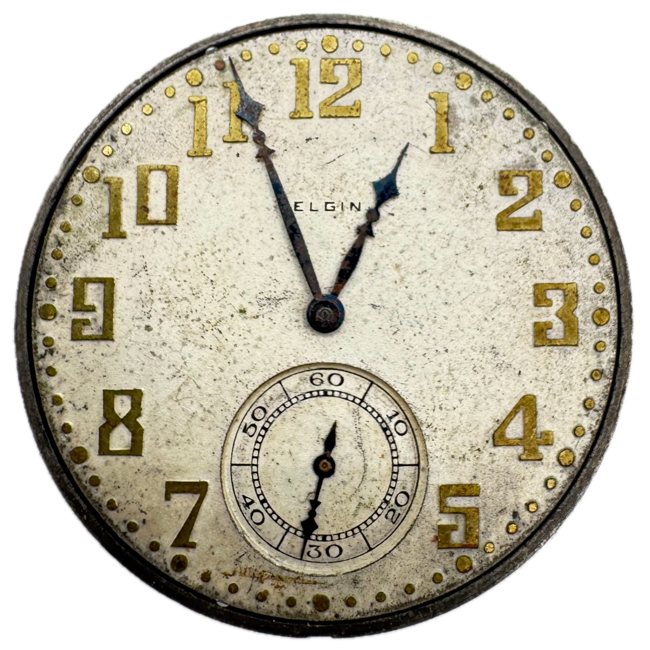 Vintage 12s 1928 Elgin 7 Jewel Mechanical Pocket Watch Movement 303 USA Product Description Item: Pocket Watch Movement Brand: Elgin Movement: Mechanical Production Year: 1928 Country: USA Jewels: 7 Jewel Gender: Men's Grade: 303 Size: 12s Product Measurements Diameter: 39.5mm Product Condition Overall Condition: Fair, overall condition for its age. Functions: Not running but the balance complete is in good condition. Dial: The dial has discoloration and spotting. Hands: There is discoloration on the hands.