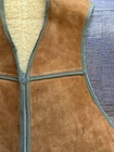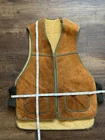 Rare and authentic 1930s–1940s military/workwear shearling vest . This WWII-era piece is similar in construction to Swedish Army M1909/M1910 shearling vests and U.S. cold-weather workwear issued to aircrew and ground crews. Crafted with a suede leather exterior , thick genuine shearling wool lining , olive drab cotton trim , and rib-knit side gussets for mobility. Front features two large patch pockets and a metal zipper closure . Measurements (approx.): Chest (pit-to-pit): 22” Length (shoulder to hem): 26” Condition: Heavily distressed from decades of use with visible hand-stitched repairs and staining (see photos). Leather is worn but supple, shearling lining intact. Zipper functional. Every mark and stitch adds to the garment’s authenticity and appeal for collectors. An incredible example of pre- and WWII-era military/workwear design — perfect for militaria collectors , heritage workwear enthusiasts , or display in a vintage collection. Keywords: vintage shearling vest, WWII leather vest, Swedish Army M1909 M1910, World War 2 workwear, USAAF bomber crew clothing, vintage ranchwear, heritage workwear, leather hunting vest, 1930s 1940s military clothing, shearling flight vest, RAF style vest, WWII cold weather gear, Americana vintage clothing, outdoor work vest, vintage shearling hunting vest, WWII collectible clothing.