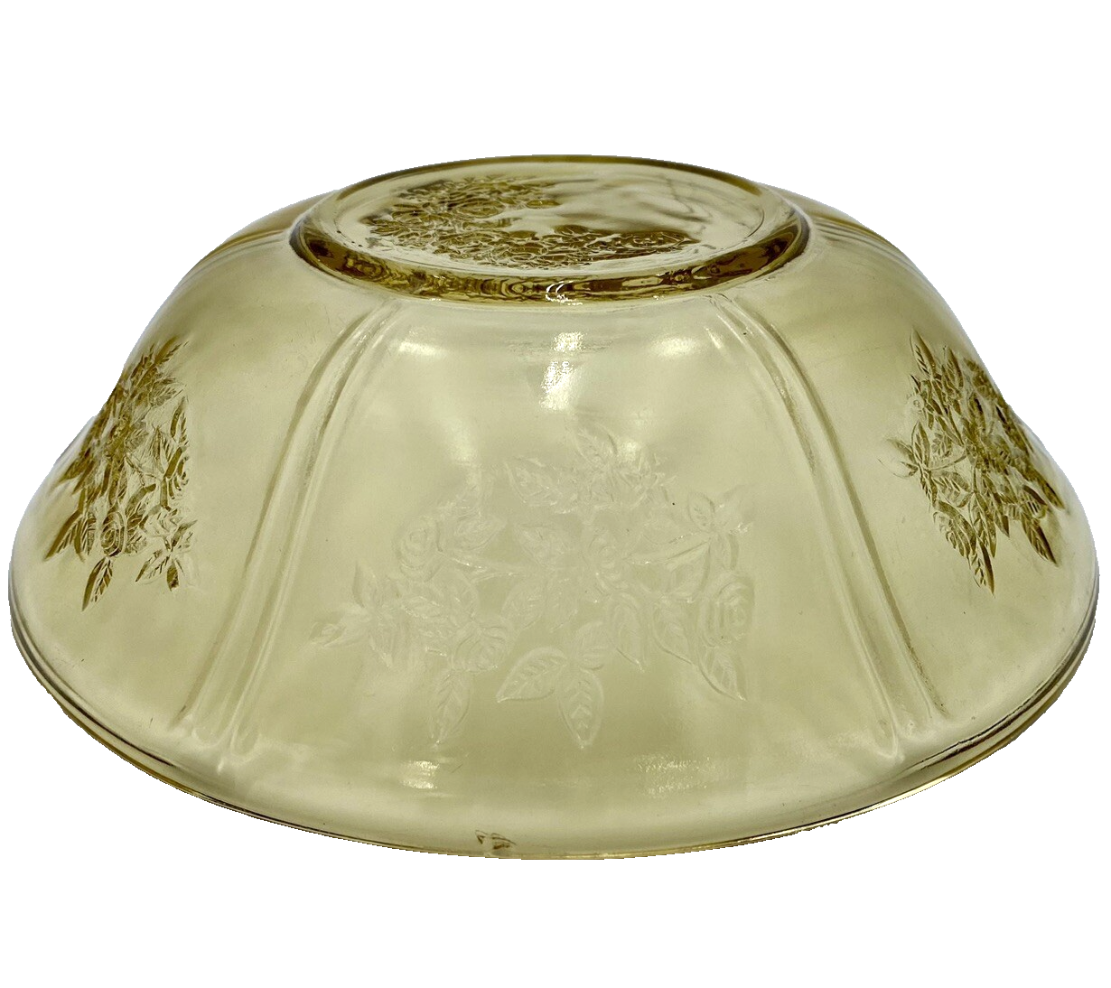 This beautiful vintage (nearly antique!) large serving bowl from Federal Glass is a stunning addition to any collection. The bowl features an embossed cabbage rose pattern in a lovely warm yellow color. Crafted in Ohio in 1936, this handmade pressed glass piece is a true retro find. The serving bowl measures 8.5 inches in width and diameter, with a height of 2.3 inches and it weighs 1 pound, 2.7 ounces. Federal Glass made this pattern (Sharon Amber) from 1935-1939. The serving bowl is in very good used condition. There are no chips or cracks. There are some surface scratches from use and there is one spot just under the rim where the glass did not pull away cleanly from the mould when it was originally made (see picture 3). Please review all the pictures as part of the description. Thank you!
