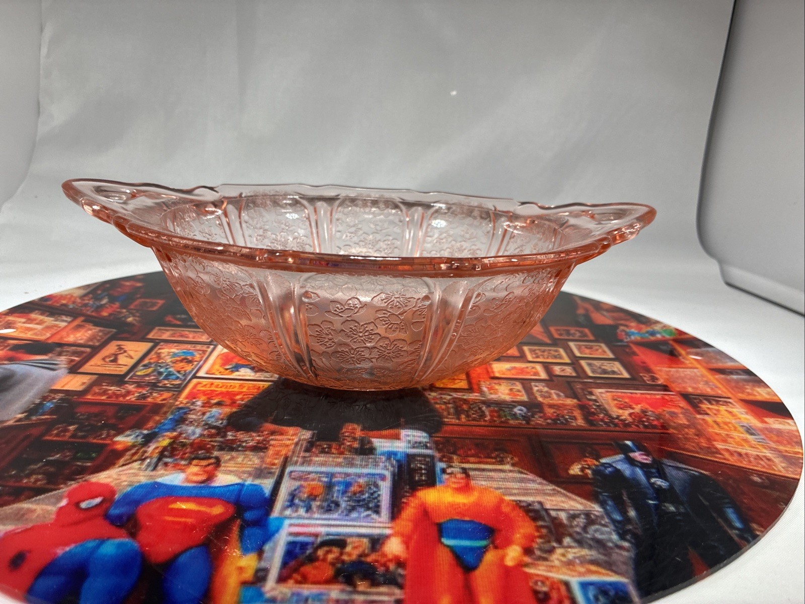 This Vintage 1930 Depression Jeanette Pink Cherry Blossom 9" Mixing Bowl with Handles is a beautiful and unique piece of antique glassware from the early 20th century. Made with a pressed glass production style and featuring a pink color with a cherry blossom theme, this bowl is a decorative and functional addition to any kitchen or dining table. With a 9" diameter and handmade in the United States, this original piece from the 1930s is a true representation of the artistry and style of The Great Depression era.