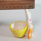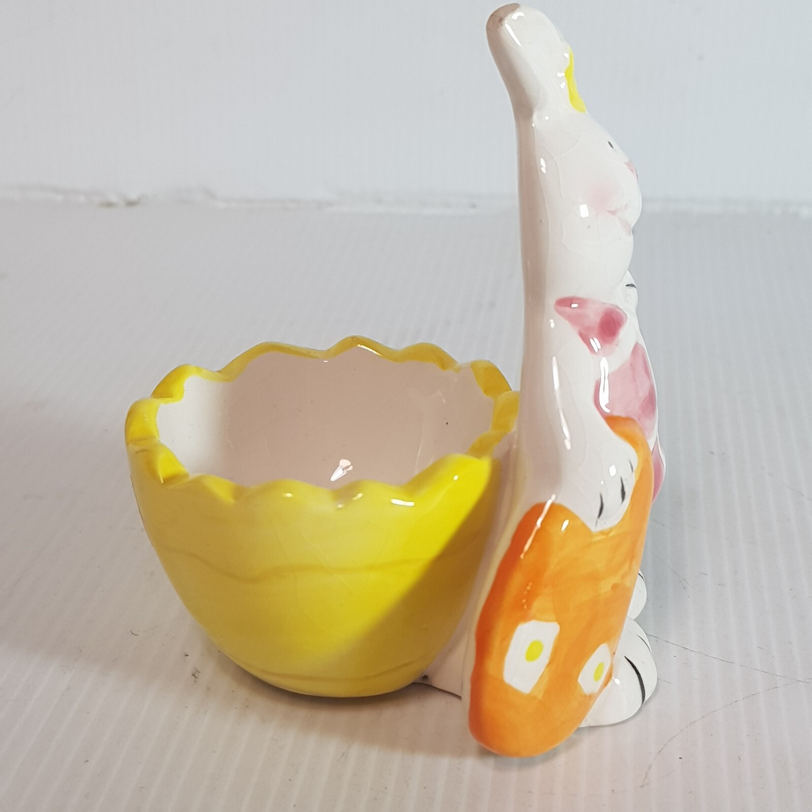 Vintage Smiling happy 1940s rabbit bunny porcelain egg cup made In Japan. This multicoloured egg cup is a charming addition to any kitchen or collection. Crafted from high-quality porcelain, this eye-catching piece showcases the intricate details of a smiling rabbit design, reflecting the craftsmanship of the era. Perfect for serving eggs in style or displaying as a unique collectable item.