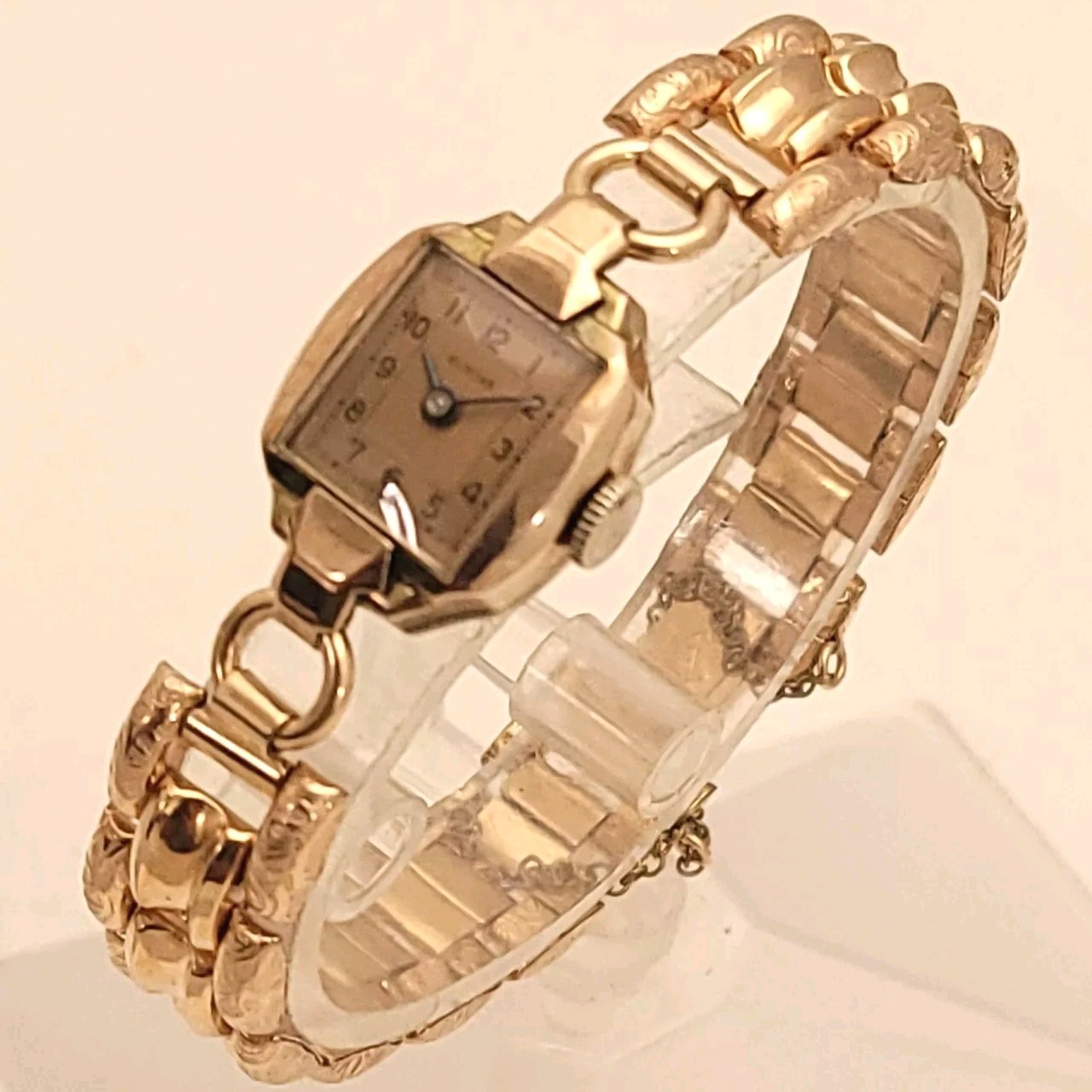 THIS IS A STUNNING 1940S HIGH GRADE SWISS LADIES COCKTAIL WATCH WITH A GORGEOUS MATCHING FACTORY ENGRAVED 1/10 12K GOLD BAND. A BEAUTY ON THE WRIST! THIS HIGH QUALITY SWISS BEAUTY IS RUNNING STRONG AND ACCURATE, WINDING SMOOTHLY AND SETTING PROPERLY, KEEPING FINE TIME. YOU'RE GOING TO LOVE TO STRAP ON THE GORGEOUS MATCHING ROSE GOLD BRACELET THAT IS FACTORY ENGRAVED. IT REFLECTS THE LIGHT WITH EVERY TWIST AND TURN OF YOUR WRIST. THIS IS A HIGH QUALITY BRACELET MADE OF 1/10 SOLID 12 KARAT GOLD. SHE WILL FIT A 6 INCH WRIST COMFORTABLY. THE DIAL IS ROSE GOLD COLOR DISPLAYING A TWO-TONE EFFECT WHEN ANGLE FROM SIDE TO SIDE. I HAD A DIFFICULT TIME GETTING A GOOD PICTURE OF THE DIAL, WHICH IS TRULY BEAUTIFUL. HER BOLD BLACK HANDS ACCURATELY DISPLAY THE PASSING TIME TO THE ARABIC BLACK HOUR NUMERALS WHICH ARE FRAMED BY A FULL TRACK OF MINUTE MARKERS. POWERING THE HANDS IS A HIGH-GRADE SWISS MADE GLYCINE 17 RED RUBY JEWELED MOVEMENT. EACH OF THE RED RUBY JEWELS ACT AS BEARINGS TO REDUCE FRICTION IMPROVING ACCURACY AND ENSURING LONGEVITY. HER MOVEMENT IS CLEAN, RUNNING STRONG AND ACCURATE. Somebody is going to be very pleased when they place the winning bid. _____________________________________ Take a few minutes and read some of the tens of thousands of positive feedback that we have received from our users here at Decowatches and our sister site Decowatchesparts and you will understand why buying a watch from us is an enjoyable and safe experience! Our shipping fee ensures that this watch is carefully packaged, has door to door tracking and comes with a three-month service warranty for your added piece of mind satisfaction and convenience! We are pleased to say that we are now shipping twice a week, either Wednesday or Thursday and Saturdays. Good luck to you all! If you enjoy collecting vintage watches as much as I do, after you place your winning bid, click on save seller next to our username. Then you can easily check back often as I will be listing a few magnificent vintage mens watches this week and every week. This week we will have a bunch of magnificent and rare watches listed.