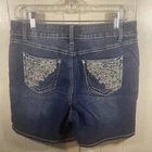 These blue denim jean shorts by EST. 1946 are a classic and modern addition to your wardrobe. The shorts feature studded, button, and zipper accents, as well as embroidered details, making them a unique and stylish choice. The high-rise waist and flat front design provide a comfortable and flattering fit, while the pockets and stretch fabric ensure convenience and functionality. Ideal for travel or casual occasions, these shorts are made from a blend of polyester, other fiber, cotton, and lycra spandex, and are machine washable for easy care. With a medium fabric wash and a denim fabric type, these shorts are a versatile and durable option for any season, whether you're walking, going to the beach, or driving.
