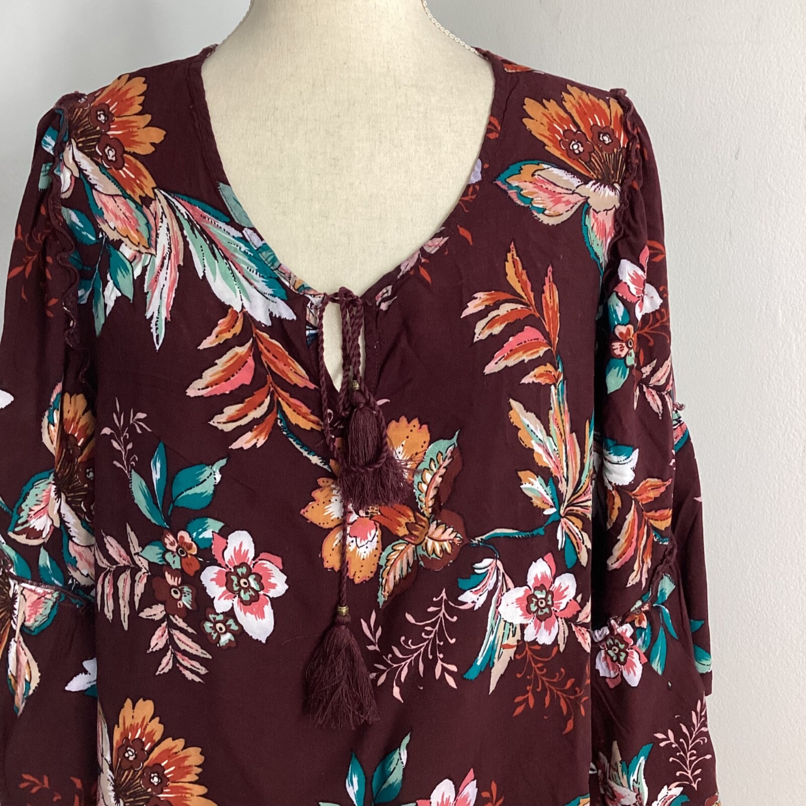 EST. 1946 WOMAN PLUS 18/20W FLORAL PEASANT BLOUSE BURGUNDY BELL SLEEVE Excellent preowned condition.No flaws. Beautiful,feminine,comfortable blouse. Measurements Aprx From pit to pit 25" Length 29"