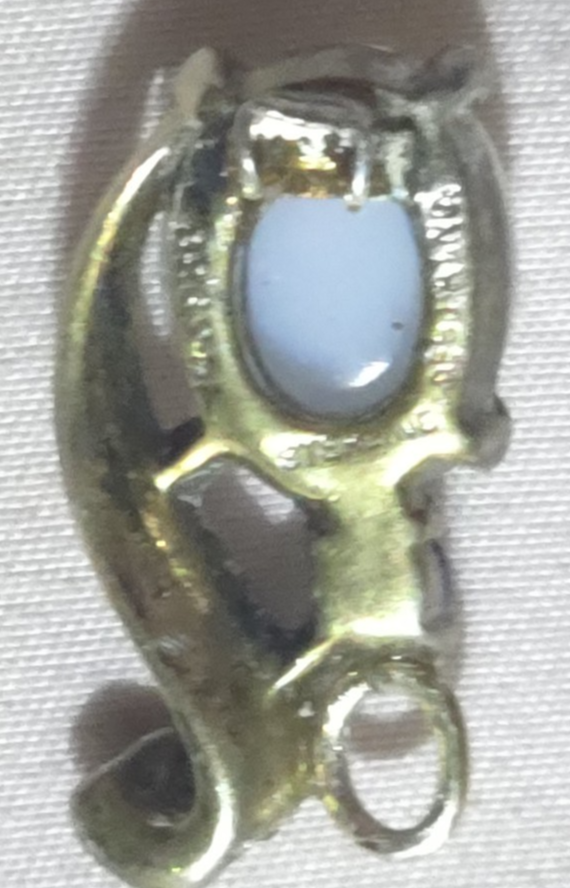 Patent No 143989 The product is a vintage Alfred Phillippe Trifari 1946 Sterling Jelly Belly Moonstone Pendant, measuring 1 inch in length. It is signed by Trifari and made of sterling silver with a prong setting style. The main stone is a white/colorless moonstone in a cabochon shape. This pendant is a stunning piece of vintage jewelry for women, with a classic and elegant design that showcases the beauty of the moonstone gemstone.