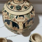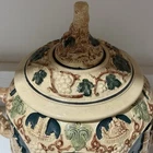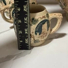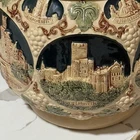 This product is a rare vintage 1950s Gerz German large castle punch bowl set, featuring three stein cups. Made of clay pottery in a multi-color design, this original vintage piece is unmarked but showcases the craftsmanship of German production techniques. Perfect for those seeking a unique and collectible piece that adds a touch of nostalgia and charm to any dining experience. There’s 4 cups total however one has a chip. It’s pictured in the final photo. Price does not include this stein. Will add at no additional cost If not wanted please message me after purchase. Thank you!