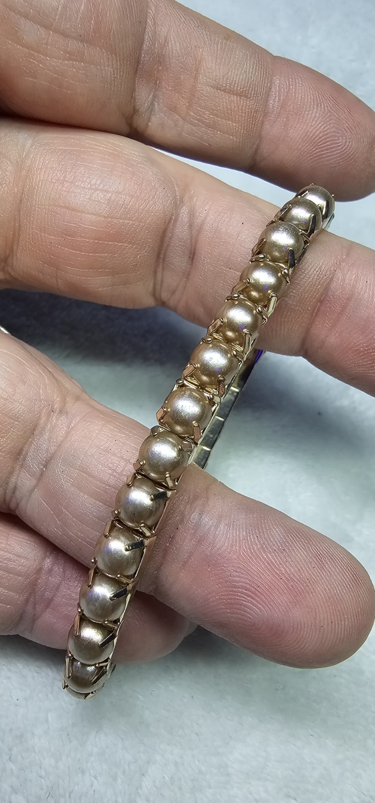 This fabulous vintage stretch bracelet from the 1950s features prong-set domed caps in a geometric square-link design. The bracelet is crafted in a gold-tone base metal with a classic expansion fit, allowing it to stretch and conform to your wrist comfortably. A beautiful mid-century statement piece, perfect for stacking, retro looks, or collectors of vintage costume jewelry. 🔹 Details: Era: Circa 1950s–1960s Fit: Stretch (approx. 2.25" inner diameter unstretched) Material: Gold-tone base metal Style: Domed rivet / faux pearl caps in square prong settings Condition: Very good vintage condition; minor surface wear consistent with age 💫 Ships carefully packaged and tracked.