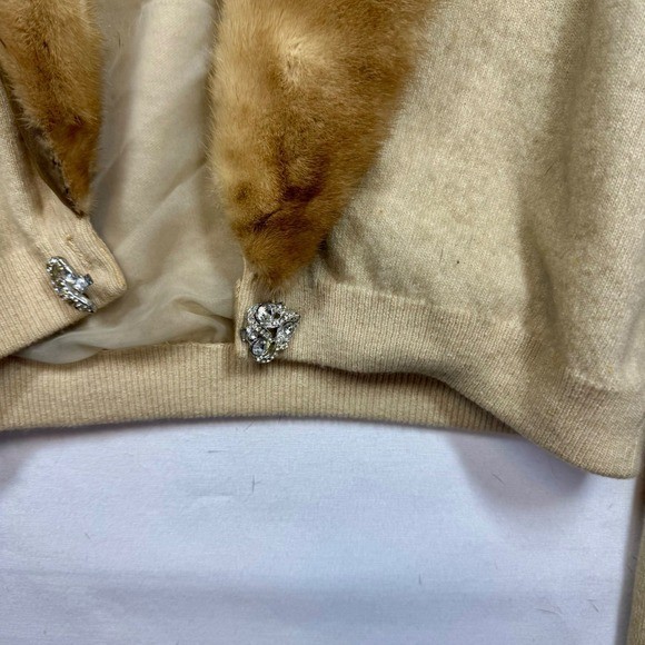 Wrap yourself in timeless elegance with this exquisite Hadley Cashmere cardigan. Luxuriate in the sumptuously soft cashmere, adorned with a plush fur collar and sparkling rhinestone button closures that capture the light with every movement. The classic beige hue offers versatile styling, perfect for elevating your ensemble. Imagine this charming piece adding a touch of vintage glamour to a special evening out or a sophisticated brunch. Measurements: • Shoulder to shoulder: 17 in • Sleeve length: 22 in • Bust (flat): 20 in • Length (shoulder to hem): 20 in Style: Cardigan Department: Women Material: Cashmere, Fur Neckline: Collared Theme: Retro Type: Sweater Sleeve Length: Long Sleeve Features: Lined Pattern: Solid Fabric Type: Knit Accents: Fur Trim, Jewel, Rhinestone Keywords: vintage sweater, fur collar, cashmere knit, rhinestone buttons, elegant, glamorous, sophisticated, evening wear, brunch attire, classic, luxury knit, designer sweater