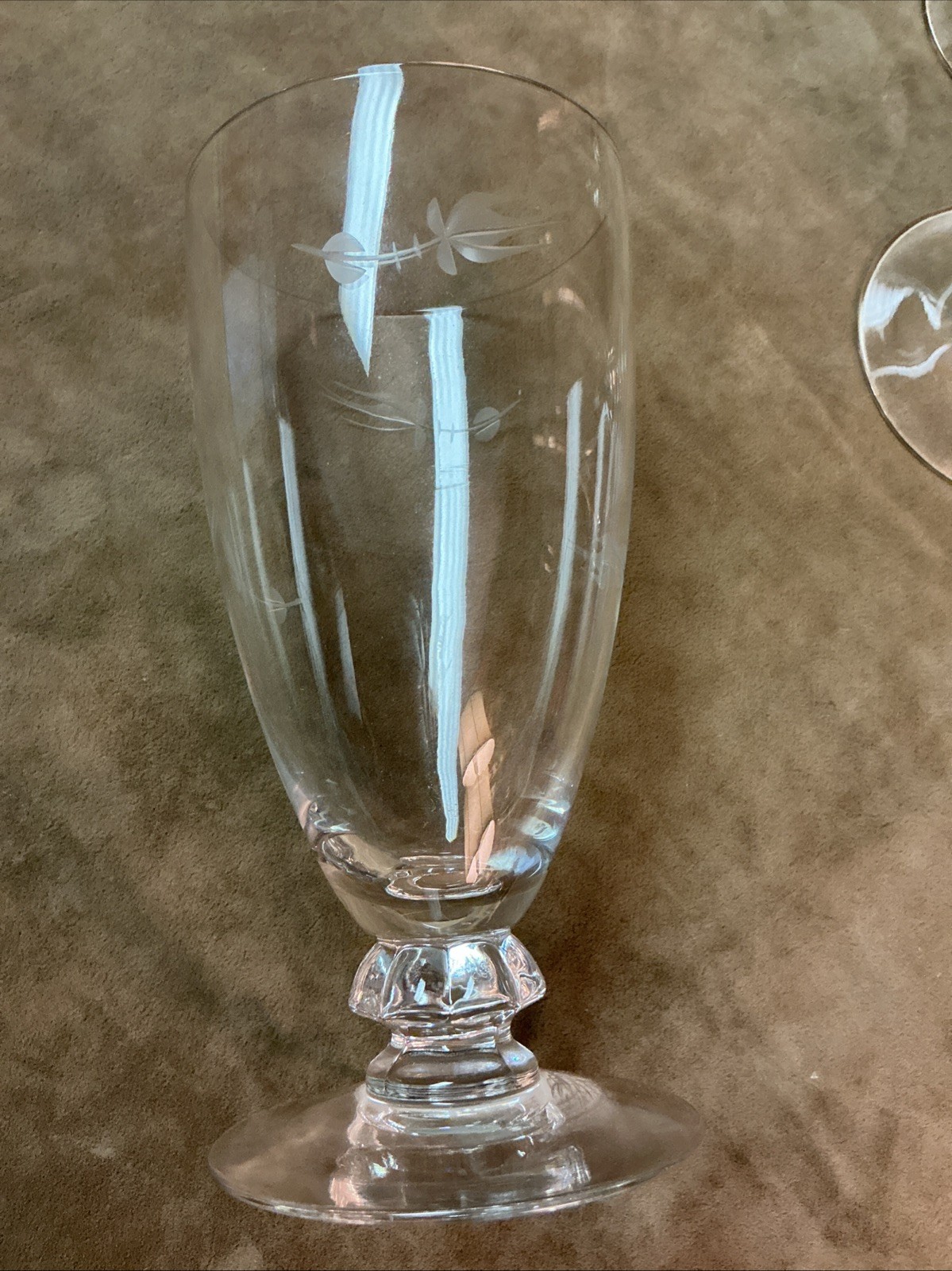 These date to 1954 and are the cut rosebud pattern by Heisey, each of these ice tea stems measures 3” x 6” and all six are in good condition