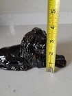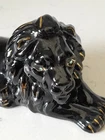 This is a rare and stunning vintage lion figurine from the 1950s. The piece features beautiful African lion gold gilt and green rhinestone eyes, giving it a unique and decorative appeal. Measuring 7" at its longest points and 3 1/2" at its tallest point, this unmarked clay pottery piece was made in Japan and is perfect for collectors of mid-century modern art deco style. The glossy finish and 3D effect make it a one-of-a-kind piece that will add character to any space.