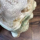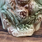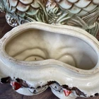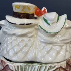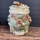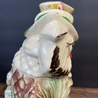 The McCoy Pottery USA Cookie Jar featuring Mr & Mrs Owl is a vintage piece from the 1950s. This large, square-shaped jar has a whimsical design with a lift-off lid, perfect for storing and displaying cookies. The cream, brown, green, and red colors of the ceramic and porcelain material give it a unique and charming look. With its antique style and fantastical theme of owls, this cookie jar is a delightful addition to any kitchen or collectibles collection. Please see photos because there are some chips in the glass.