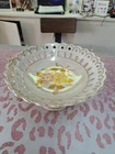 This vintage 1950s porcelain pedestal compote dish features a floral pattern on a round shape with a glossy white finish. Hand-painted and made of porcelain, this candy dish exudes a classic charm perfect for displaying sweets or small treats. The unmarked dish showcases art pottery production style with a flower theme, making it a delightful and elegant addition to any home decor with its vintage appeal.