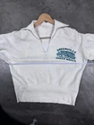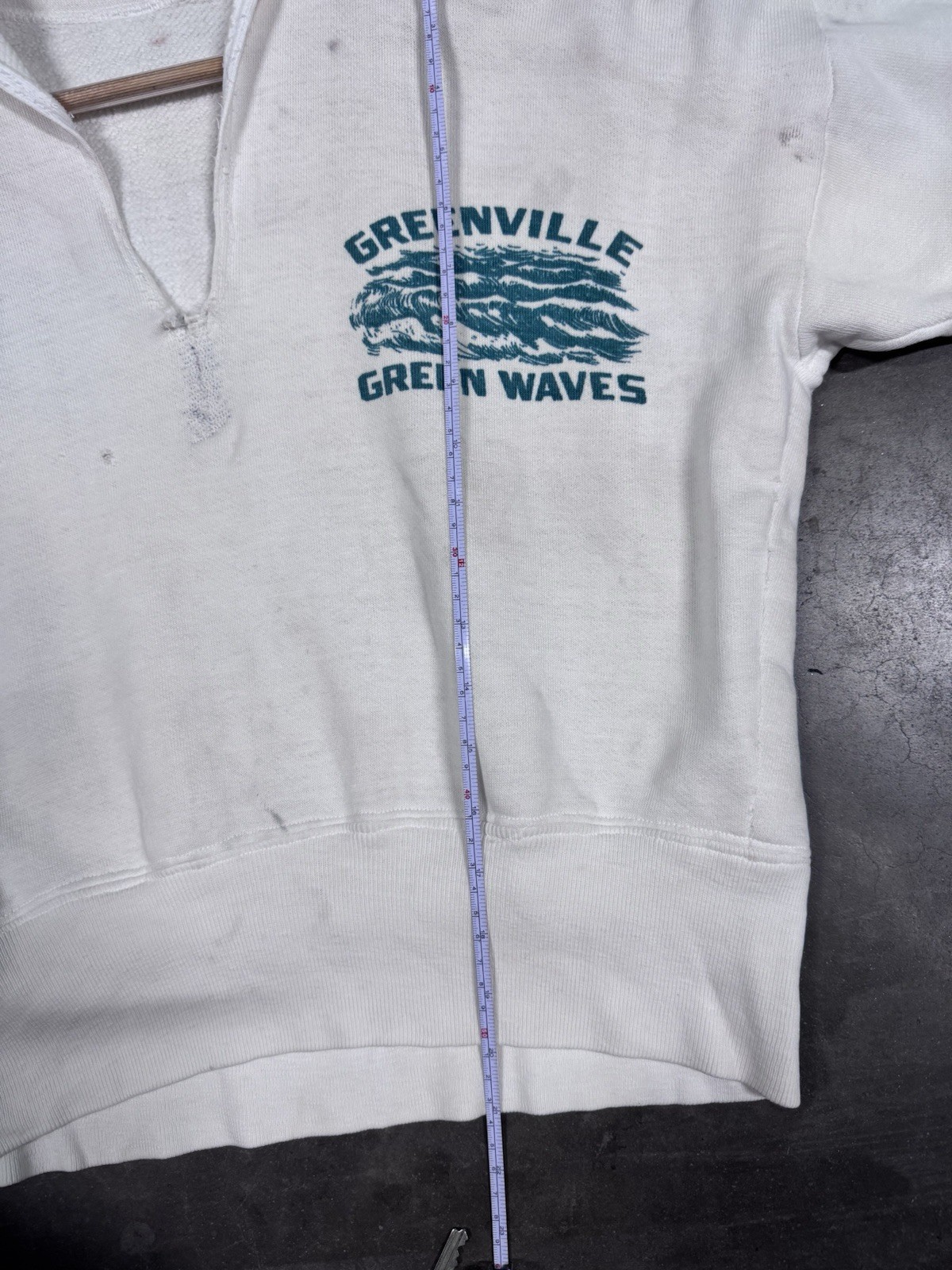 This Vintage 1950s Quarter Zip *missing zipper* Sweatshirt in Greenville Green Waves is a classic piece of men's clothing. Made from comfortable cotton material, this medium-sized sweatshirt features a solid white color with a crew neck and long sleeves, making it perfect for the winter, fall, and spring seasons. The quarter zip closure adds a stylish touch to this pullover sweatshirt, which is machine washable for easy care. Whether you're looking for a casual yet timeless addition to your wardrobe or a stylish statement piece for walking activities, this vintage sweatshirt is sure to impress.