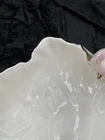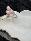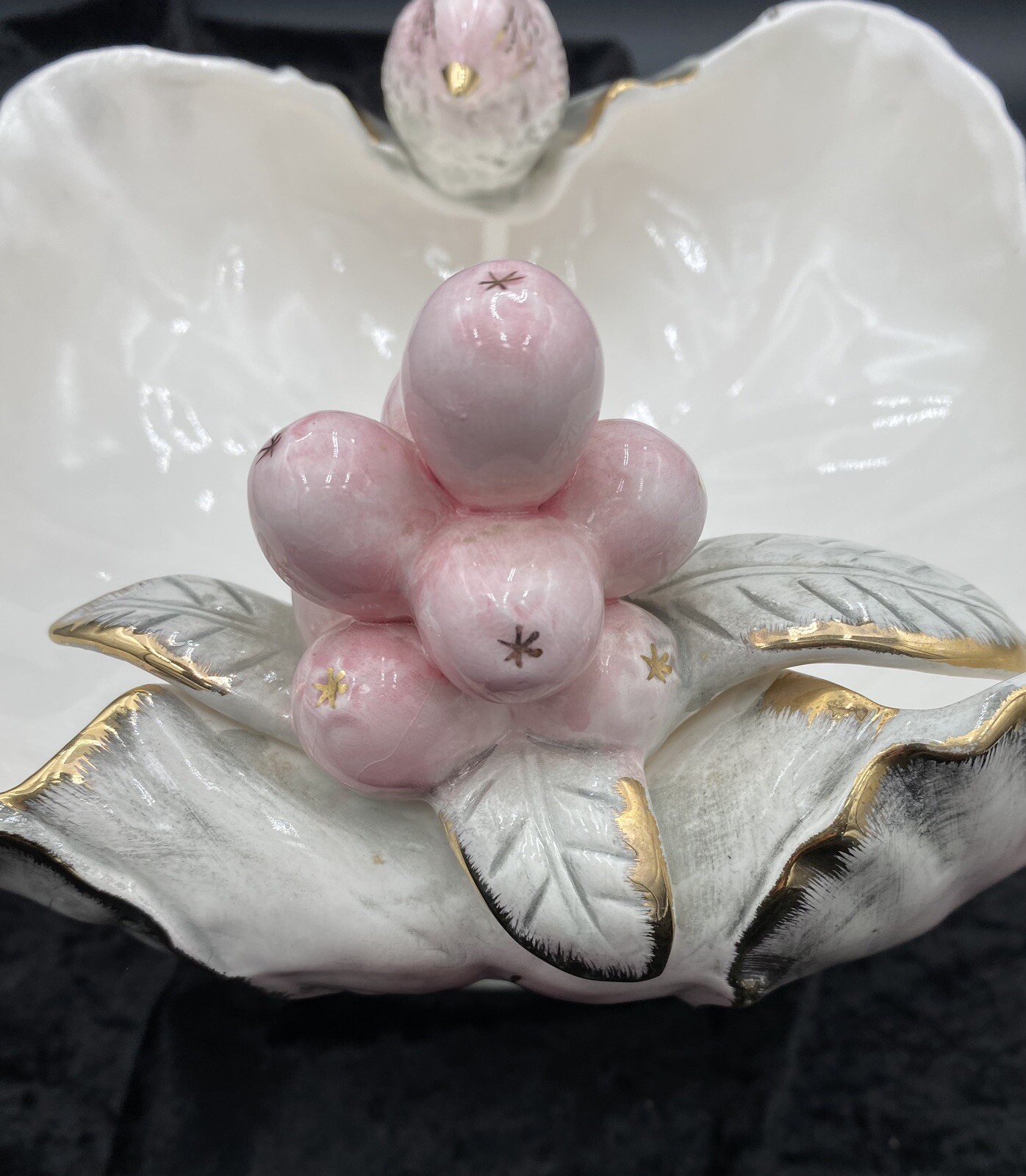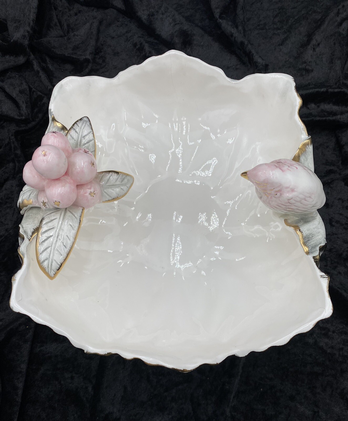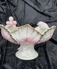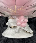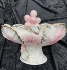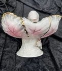 Add a touch of vintage charm to your dining table with this beautiful Ucagco pedestal centerpiece bowl. The piece is hand-painted in shades of pink and light gray, with gold used to highlight features, accents and edging. This original piece from the mid-20th century (the early 1950s) is a must-have for collectors and enthusiasts alike. It has a weight of 2 pounds and 1.4 ounces, and measures 9.25 inches in width and 8 inches in height. The bowl depth is 2.5 inches, making it a perfect addition to any table setting. This centerpiece bowl would be perfect for a winter table! The porcelain centerpiece bowl is in very good used condition. There are no chips. There is a hairline crack on one leaf of the bowl (see picture #12). Otherwise, there is little to no wear; there are a few typical manufacturing blips. Please review all pictures as part of the description. Thank you!