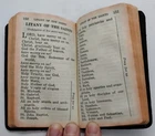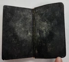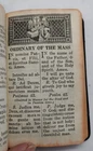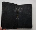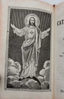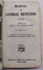 Vintage Pocket Manual Of Catholic Devotions, Monogrammed JHS, published in 1952 by Catholic Book Publishing Co. Black genuine leather binding with the monogram of JHS on the front cover. Small, dimensions are about 2.75 by 4.5 inches. Select illustrations throughout the volume. Pages are unmarked. Good used condition for its age, but there are signs of wear including discoloration to pages, worn off gold edging, back page separating from cover, and visible wear/residue inside both front and back cover pages. Please see pictures for more detail.