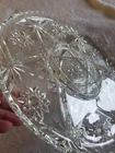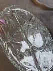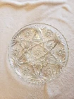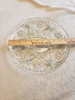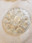 This vintage 1960s Anchor Hocking decorative plate features a Star Of David pattern on its round 11" divided crystal surface. Made in America, this antique piece from the Mid-Century Modern era is part of the Early American Prescut/EAPC product line. The glossy finish adds a touch of elegance to this pressed glass plate, which is perfect for Christmas, party, or other occasions. With a clear color and a weight of 2lb 7oz, this plate is a unique addition to any collection or table setting.