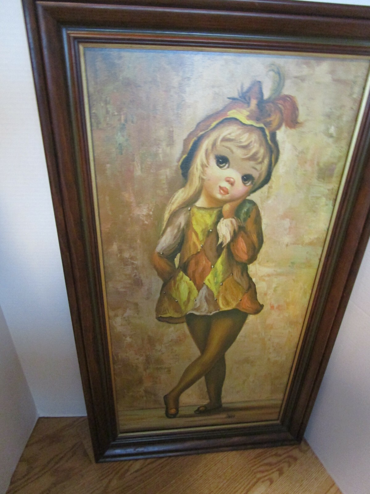 DESCRIPTION: 13-40-24/8 Large Midcentury Modern Vintage art print by Jean Maio* in the Big Eyes style of Margaret Keane. It shows a harlequin girl pixie done in earthy tones. Framed. Image is printed directly on the hard board /Masonite back panel - Made in United States 1960’s period Measures approximately 34" Tall x 18.75" wide x 2” deep. Unpacked weighs about 6.50 lbs. Pine wood frame with dark walnut finish about 2” wide and 2” deep, with a gold tone edge going around the print. Great vintage condition- Nice clean – no stain with an appropriate wear on the wooden frame such as scuffs. Please zoom and view all pictures for more details as they are part of the description. *Jean Maio (1924 - 1987) was active/lived in Florida. Jean Maio is known for Big eyed harlequin children. Margaret Eugenia “ Jean , Maio ” Stewart Toti Thomis was born on November 23, 1924 in the United States. She is well known for her big eye harlequin children and a contemporary of Margaret Keane. I DO MY BEST TO DESCRIBE EVERY LISTING BUT I AM NOT AN EXPERT AND ITEMS ARE SOLD “AS IS”. My idea of great/good may be different than yours, so EXAMINE PHOTOS CAREFULLY since they are binding and a supplement to the word description in case, I should miss something. If I fail to mention something, it does not qualify as “item not as described” if it shows in my pictures. EACH PHOTO IS WORTH A THOUSAND WORDS AND THEY ARE OF THE EXACT ITEM YOU WILL RECEIVE. RETURN POLICY: Returns are acceptable ONLY if the item doesn’t match the description, is defective, or grossly misrepresented. THIS MEANS I DO NOT ACCEPT RETURNS for FIT, SIZING, COLOR ISSUES, OR BUYER'S REMORSE. Please zoom and view ALL pictures for more details as they are part of the description. Email me with any questions you may have. Please note: Buyer pays ALL return shipping and fees. Postage is fully tracked FEEDBACK I do not leave feedback until the end of a transaction. The transaction is considered over once I receive feedback from you confirming that you have received it and expressed satisfaction with it. If you are unsatisfied with your purchase, please contact me before leaving a neutral or negative feedback- so I can fix the issues.