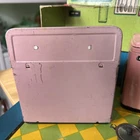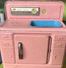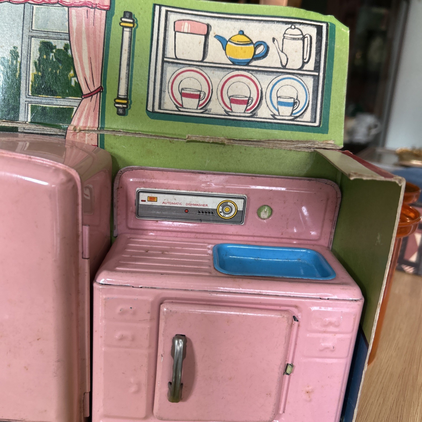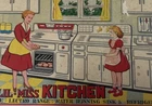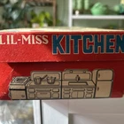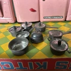 Wonderful vintage toy kitchen set in great used condition. Minor rust on one piece. Original box opens to form kitchen area. Includes lots of pots for play.