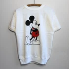 Recommended size: Small Chest: 20" | Length: 25" Tag: Walt Disney Products (sewn-in paper tag) Material: 95% Cotton, 5% Acrylic Features a crisp and bold Mickey House graphic print on an all white cotton blended short sleeve crewneck sweatshirt, and in deadstock condition. *Please expect normal signs of wear and use as this item is in vintage condition (20+ years old). All sales final.