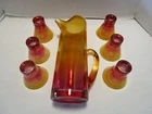 DESCRIPTION- 9/16/12/13/ book # 584 Vintage Mid Century Modern Barware 7 Piece martini cocktail pitcher set Ombre amberina orange /red/ yellow tones. The set is rarely found complete like this and still in good condition. Probably made in USA. The pitcher has a pitched lip, curved open handle, straight sides. - it does have some color drippings by the spout -see last pictures. It is 11” tall x 7” across the handle and spout, it is 3.75” across the body It is designed to hold up to 48 Oz. It comes with 6 matching glasses with weighted base flared sides martini cocktails glasses. Each glass is 3.25” tall x 3.25” across the rim 2.5” the footed base, each holds 5 Oz. brim full Great vintage used condition- no chips or cracks- ready to be display or use. Please zoom and view on all pictures for more details as they are part of the description. I DO MY BEST TO DESCRIBE EVERY LISTING BUT I AM NOT AN EXPERT AND ITEMS ARE SOLD “AS IS”. My idea of great/good may be different than yours, so EXAMINE PHOTOS CAREFULLY since they are binding and a supplement to the word description in case I should miss something. If I fail to mention something, it does not qualify as “item not as described” if it shows in my pictures. EACH PHOTO IS WORTH A THOUSAND WORDS AND THEY ARE OF THE EXACT ITEM YOU WILL RECEIVE. RETURN POLICY: Returns are acceptable ONLY if the item doesn’t match the description, is defective, or grossly misrepresented. THIS MEANS I DO NOT ACCEPT RETURNS for FIT, SIZING, COLOR ISSUES, OR BUYER'S REMORSE. Please zoom and view ALL pictures for more details as they are part of the description. Email me with any questions you may have. Please note: Buyer pays ALL return shipping and fees. If you use an eBay shipping label, it will be deducted from your refund amount. FEEDBACK I do not leave feedback until the end of a transaction. Transaction is considered over once I receive feedback from you confirming that you have received it and expressed satisfaction with it. If you are unsatisfied with your purchase, please contact me before leaving a neutral or negative feedback- so I can fix the issues.