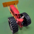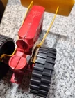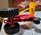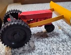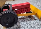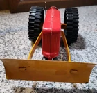 This little red tractor is unique. It looks like it is made by Slik or Hubley and has a bulldozer blade attachment affixed to the front with a lever control to raise and lower the blade. Paint looks really good for its age, but does have light scratches and paint chipping in heavy wear areas. Please see photos of the item for a visual description.