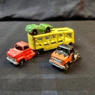 Vintage 1960's Tootsietoy Semi Trucks & Yellow Car Transport Trailer w/ 1 Car I'm liquidating my die-cast collection, so I'm creating some really great collections, and making some awesome deals. I think this is a great lot of Tootsie Toys Tractors and Trailer. They've got a lot of paint chipping, like most tootsie toys. I remember the original tractor and trailer set came with 2 little sports cars, but I could not find the other one. Both tractors have some hand painting on them. I'll list them out, so you can see what you'll be getting. You get: Tractor - red, with some silver hand painting on it. Little Sports Car - green. Tractor - black, with orange and silver hand painting on it. Car hauler trailer - yellow. Thanks for looking!