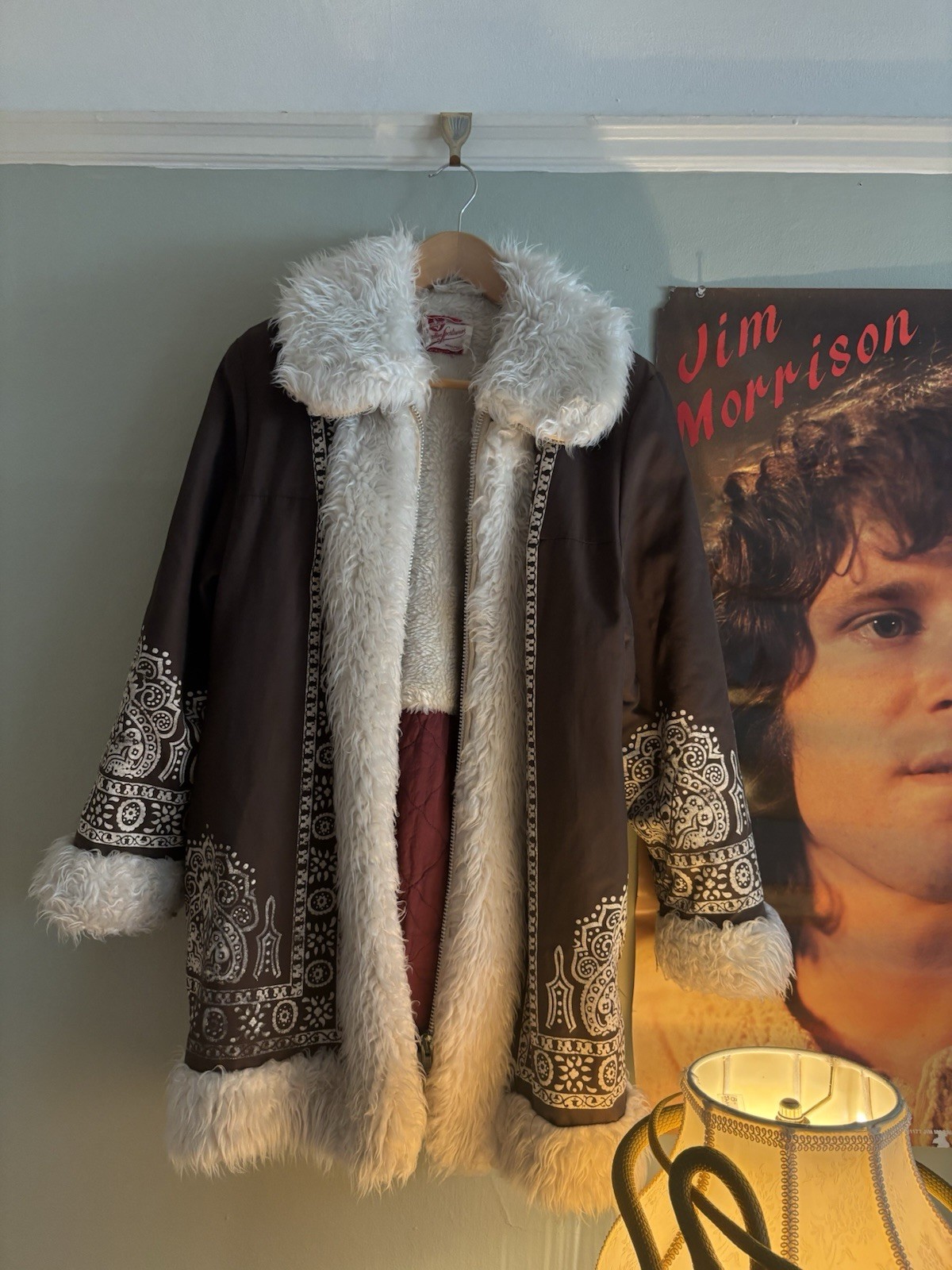 The most gorgeous vintage 1960s fur trimmed brown penny lane afghan coat with stenciled details and red quilted lining. Small tear in one of the pockets but can be easily repaired!