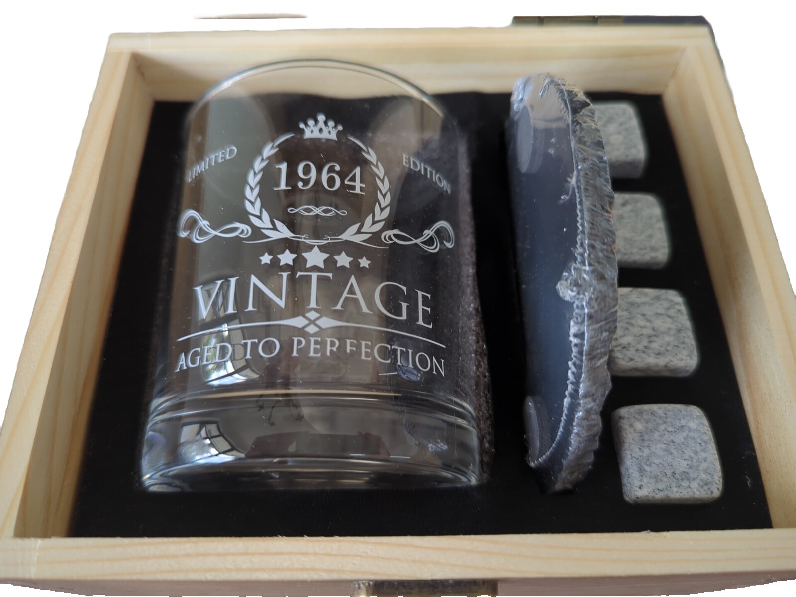 Whiskey Stones & Glass Set Vintage Aged to Perfection Limited Edition 1964 NEW NEW IN BOX Set includes wood storage box, 4 freezer stones, slate engraved coaster, and whiskey drinking glass. Buy with confidence as I am a long time eBay seller proud to have earned 100% positive customer feedback. Ships carefully packaged and promptly from my smoke-free home.