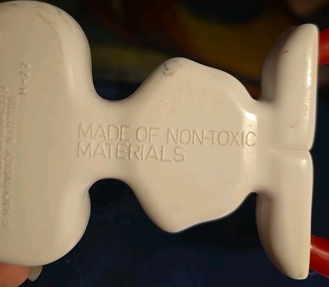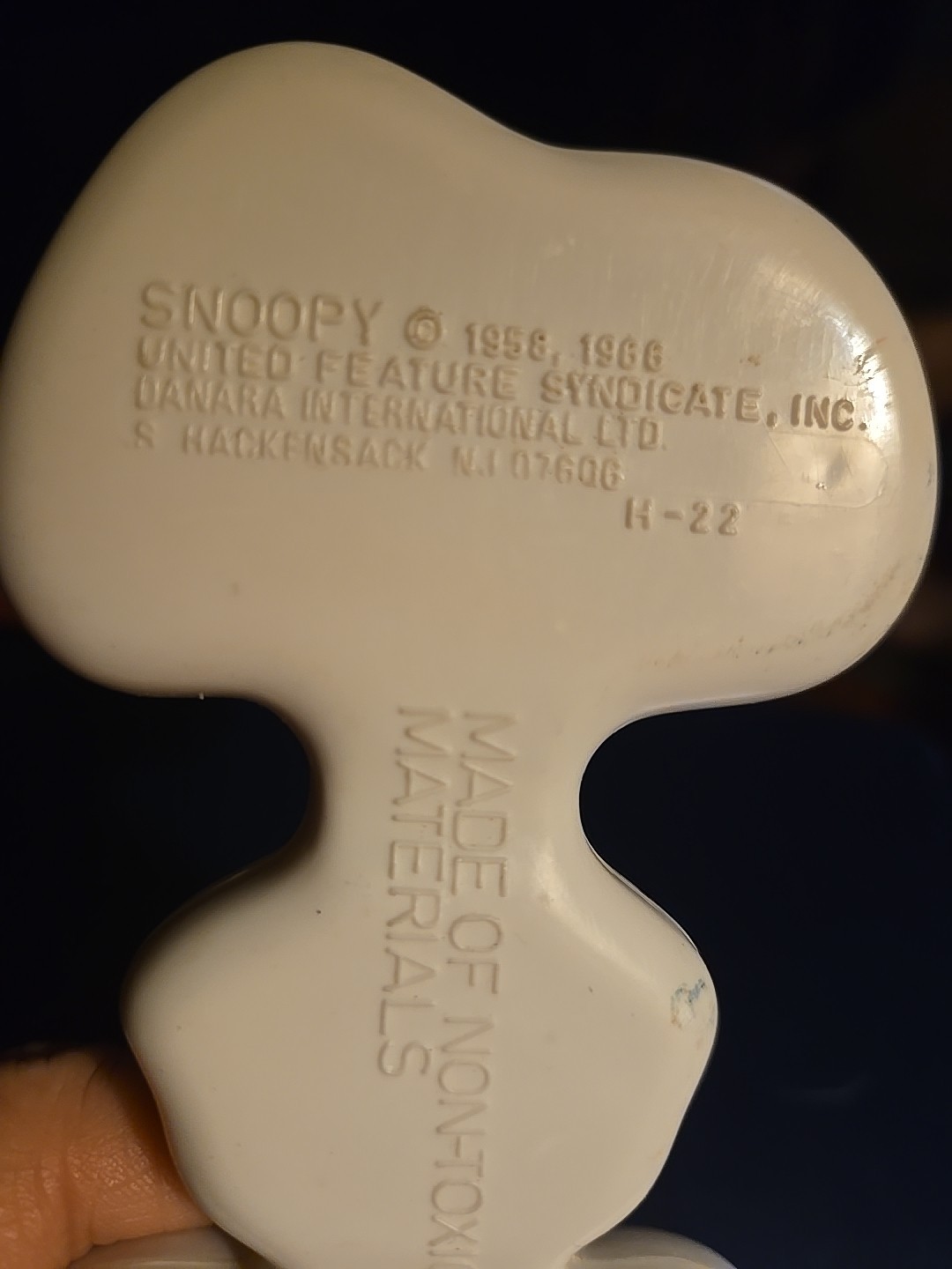 The vintage 1966 Peanuts Snoopy rattle features the beloved cartoon character Snoopy holding a red daisy flower. Made of plastic in the United States, this collectible item is part of the Peanuts franchise and appeals to fans of animation and cartoon characters. The English language rattle is a colorful piece of nostalgia that captures the charm and whimsy of classic Peanuts comics.