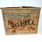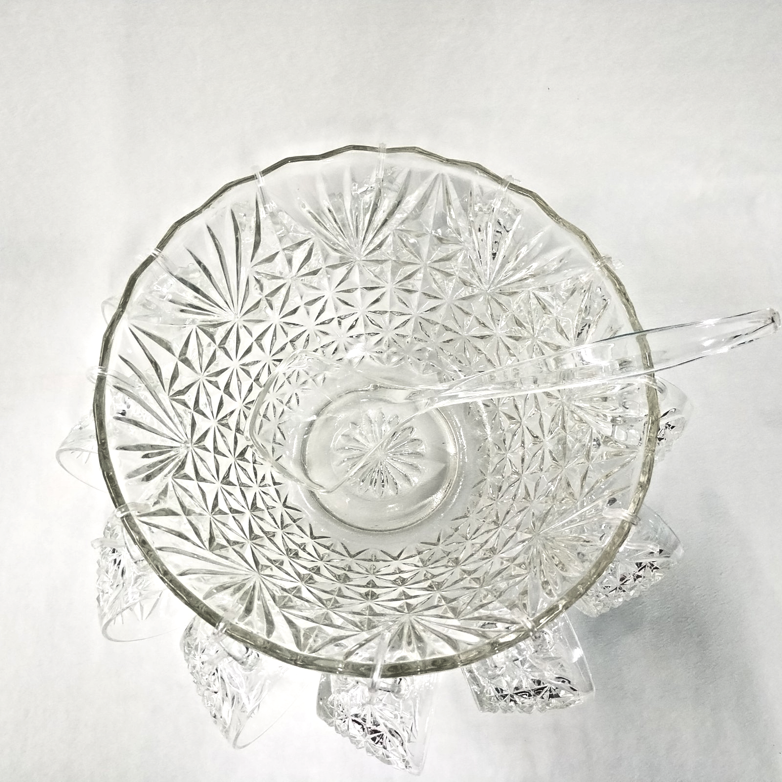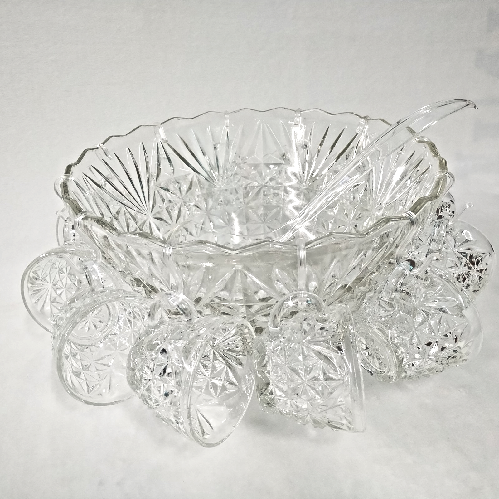 This vintage punch bowl set is absolutely stunning! The clear, glossy glass sparkles beautifully, and the intricate cut design adds a touch of classic elegance. Perfect for parties or as a collector’s piece, it’s in amazing condition with all 26 pieces intact—even the original box! A true gem that brings retro charm to any occasion. Love it!