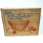 Elevate your serving game with the vintage 1970’s Anchor Hocking Arlington Punch Bowl Set, a timeless addition to your home or collection. The twenty-six piece set, complete with a punch bowl and assorted pieces, is crafted from clear, glossy glass that sparkles under the light, adding a touch of elegance to any gathering. With its decorative cut glass design and American theme, this set is perfect for all occasions, whether you're hosting a formal dinner or a casual get-together. The fused glass production technique ensures durability, while the round shape and unisex design make it a versatile choice for any decor. Carefully designed for a seamless hand wash, this original, Anchor Hocking set is a testament to classic style and functionality.