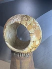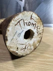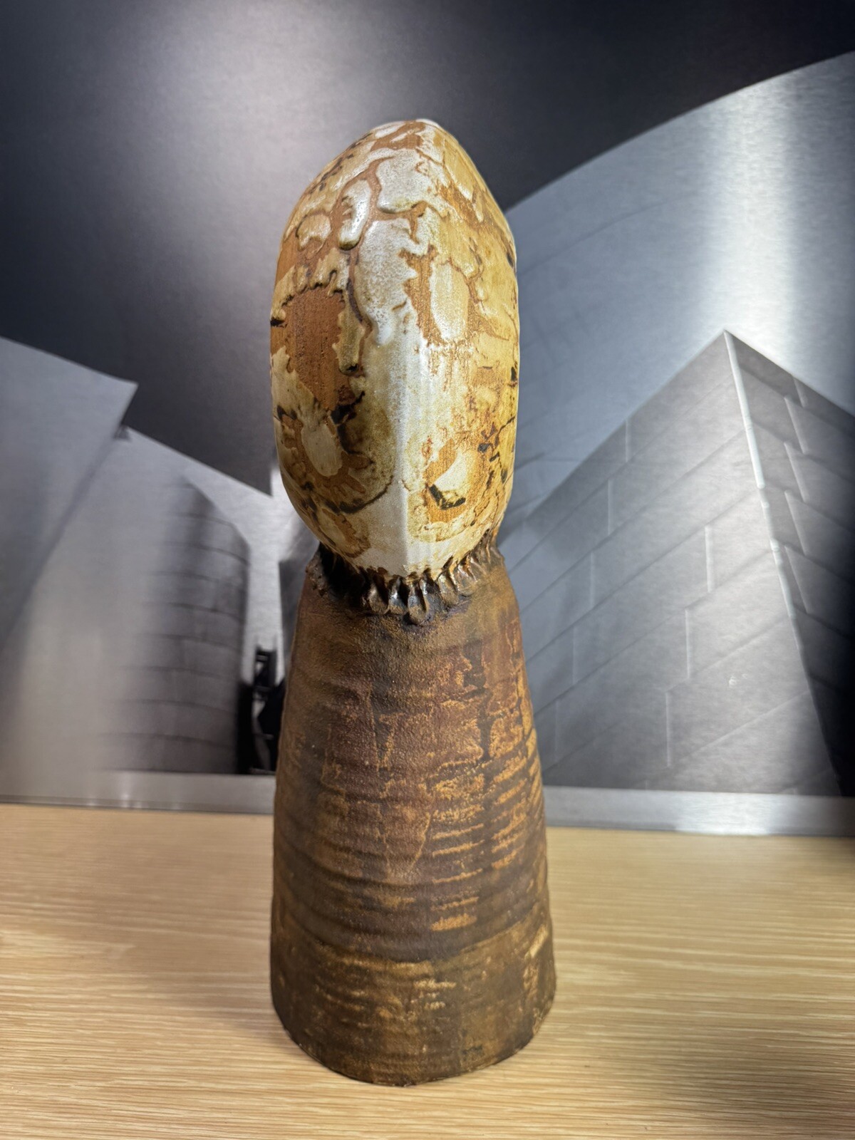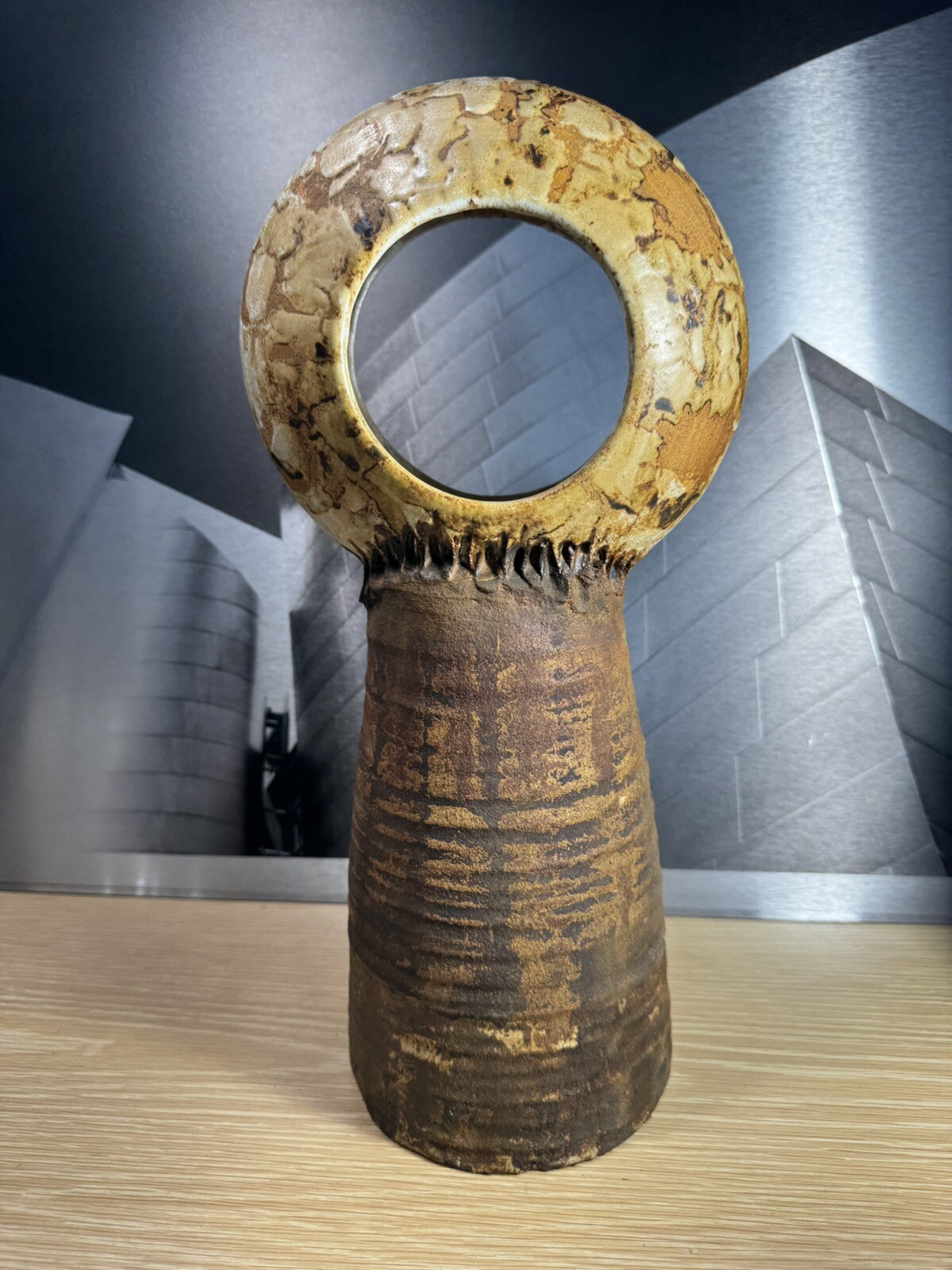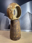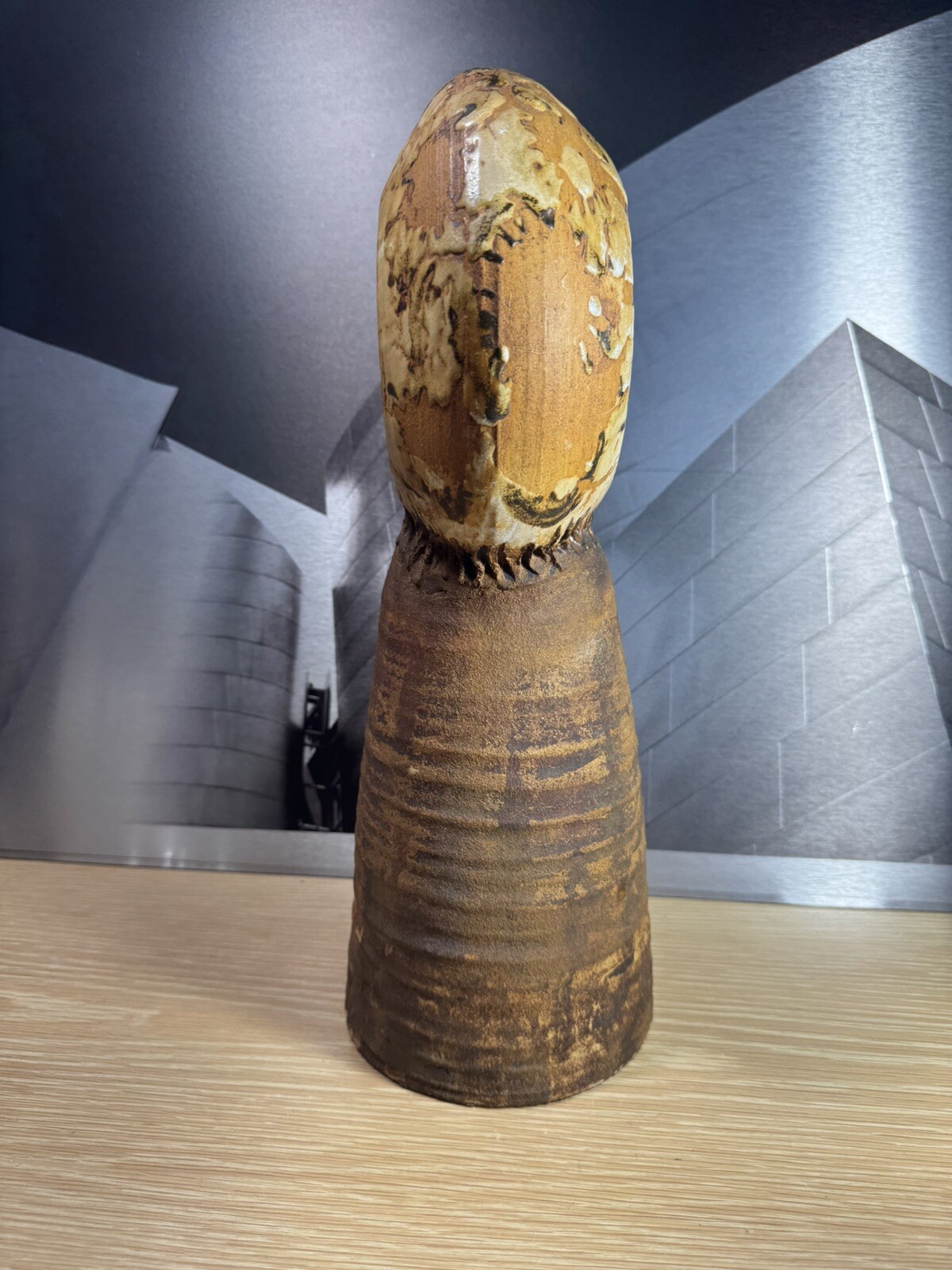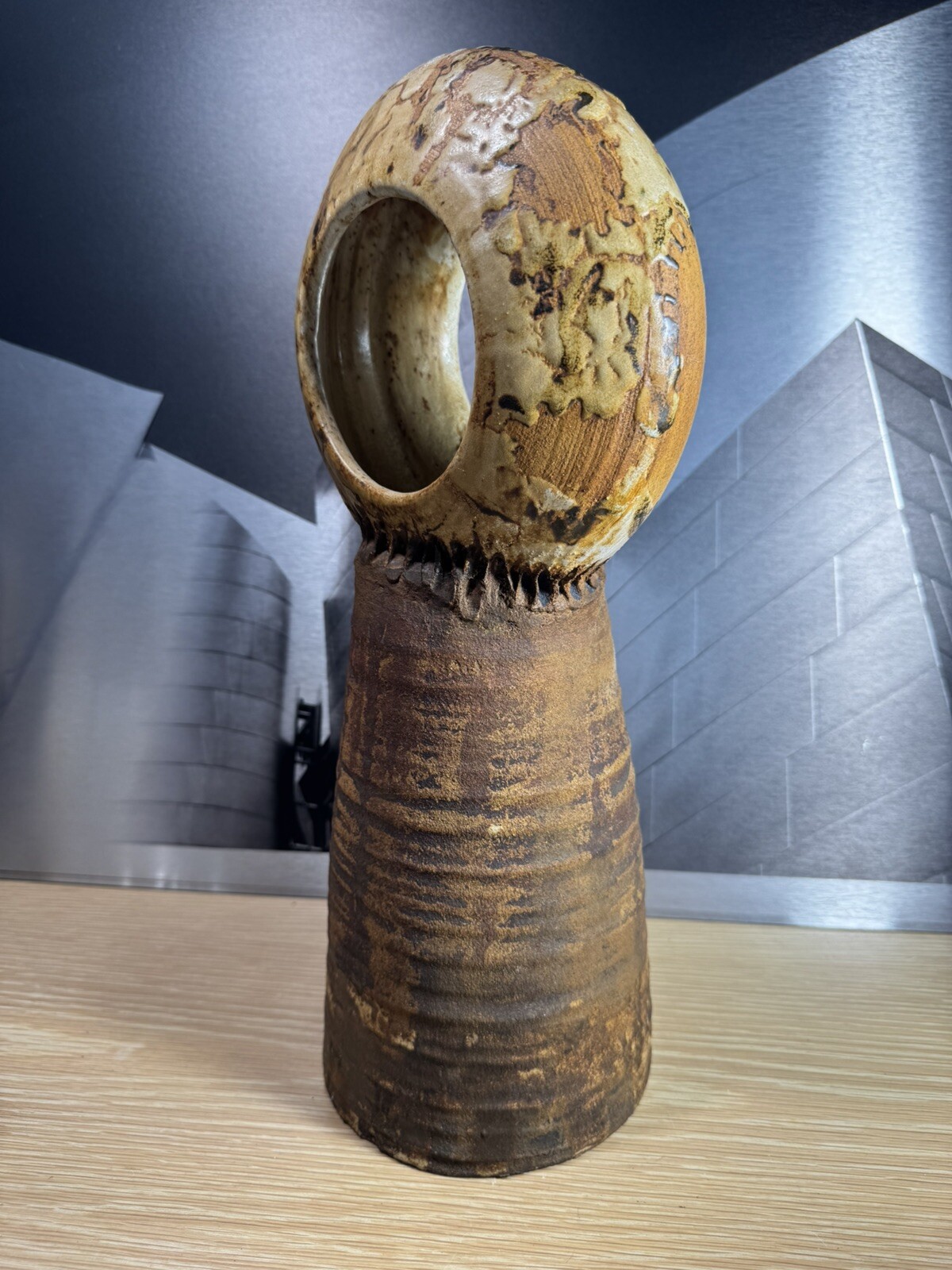 The vintage 1970s abstract studio pottery sculpture is a handmade piece signed by the artist, showcasing an abstract style with a textured finish. Made from clay and stoneware, this brown sculpture stands at 15 inches tall and embodies the abstract art theme of the late 20th century. Produced as original art pottery in the United States during the 1970s, this unique piece reflects the mid-century studio pottery movement and is a true representation of the era's artistic vision. it’s a n impressive sculpture that measures 15 1/4 x 7 x 5 1/2 Signed L Thompsen 70 - (Larry Thomsen) California