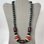 Vintage Chunky Retro 1970s Large Stained Wooden Beaded Necklace 24" Barrel Clasp Great condition! The stained wood beads are clean and look beautiful. The silver tone barrel clasp works as it should. Please see pictures for details and message me with any questions.
