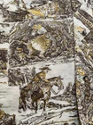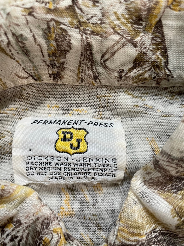 Dickson-Jenkins Vintage USA Pearl Snap Shirt Permanent Press Rare 70s Graphic Cowboy Print Style: Snap close, collared, long sleeve, Yoke trim with snap pockets Fabric: Permanent Press poly Color: Tan, brown with fabulous Western and Cowboy graphic scenes Approximate flat measurements: Pit to pit 21 1/2", Length back neck to hem 27", Sleeve 20" Condition: Preowned vintage with general wear- no spots or holes. Tag size: no tag - presume Medium per chest measurements shown in photos and listed above however sleeves are short Cleaned per Ebay Standards