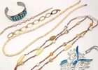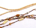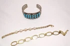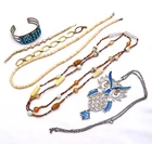 Vintage 1970's Jewely Lot 6 Pieces 3 Necklaces 3 Bracelets Turquoise Opal Beaded necklace has beads of glass and wood. 46" around Beige necklace is beaded shell discs and is 23" long Owl necklace has blue enamel highlights and rhinestone eyes. The owl is 5" long, necklace chain is 24" around. Goldtone link bracelet is 7" long. Cuff bracelet has turquoise stones on it, none are missing. The silver metal they are on is very sturdy and not easily bent. Measures about 5.5" around, not including the open back. Slender goldtone bracelet has 5 opals in settings on it. Stones give off a beautiful pink, green, blue, sheen. 7.5" long All pieces are in good condition and are 1970's vintage.