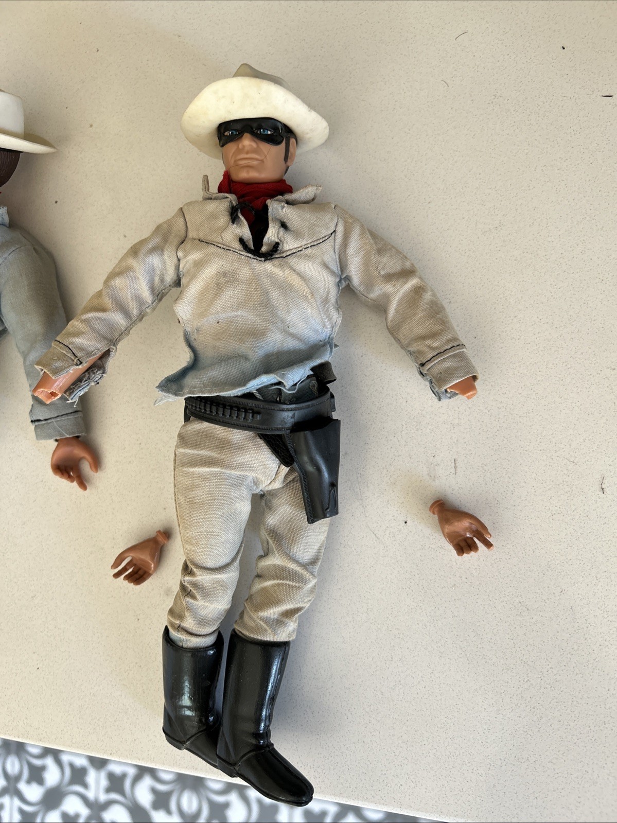 The product is a lot of three vintage 1970's Lone Ranger action figures and two horses. These collectible toys are in need of repairs, making them a unique project for collectors or enthusiasts. With the iconic character of the Lone Ranger and the classic 1970's design, this lot offers a nostalgic touch for those looking to add to their action figure collection. See pictures for conditions of each figure, ask questions any questions if needed, thank you.