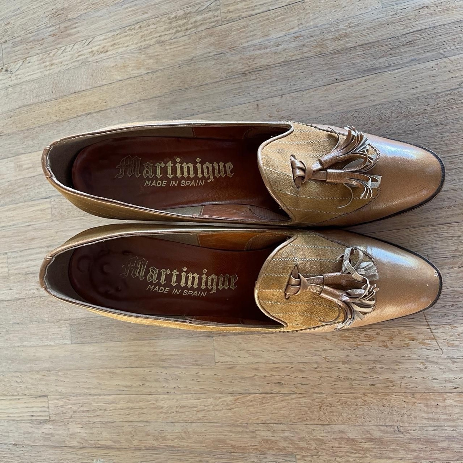 Step back into the polished elegance of the 1970s with these Martinique leather loafer heels, expertly crafted in Spain. Featuring a warm tan leather upper, stitched vamp, and playful tassel detail, they balance preppy sophistication with retro charm. The sturdy block heel offers both height and comfort, making them the perfect choice for vintage lovers, modern retro stylists, and dark academia enthusiasts. Details: Brand: Martinique Made in Spain Size: 6.5 Color: Tan Material: Genuine leather upper, leather lining, leather sole Features: Loafer-style vamp with tassel detail, stitched paneling, rounded square toe, block heel (approx. 3") Condition: Good vintage; visible wear to soles and leather uppers consistent with age and prior use Trending Style Tags & Categories: #1970sVintage #RetroHeels #DarkAcademia #VintageLoafers #PreppyStyle #BlockHeels #QuietLuxury #MadeInSpain Hashtags: #Vintage1970s #MartiniqueShoes #TasselHeels #RetroLoafers #BlockHeelPumps #TanLeatherShoes #PreppyVintage #DarkAcademiaStyle #70sFashionShoes #MadeInSpainShoes