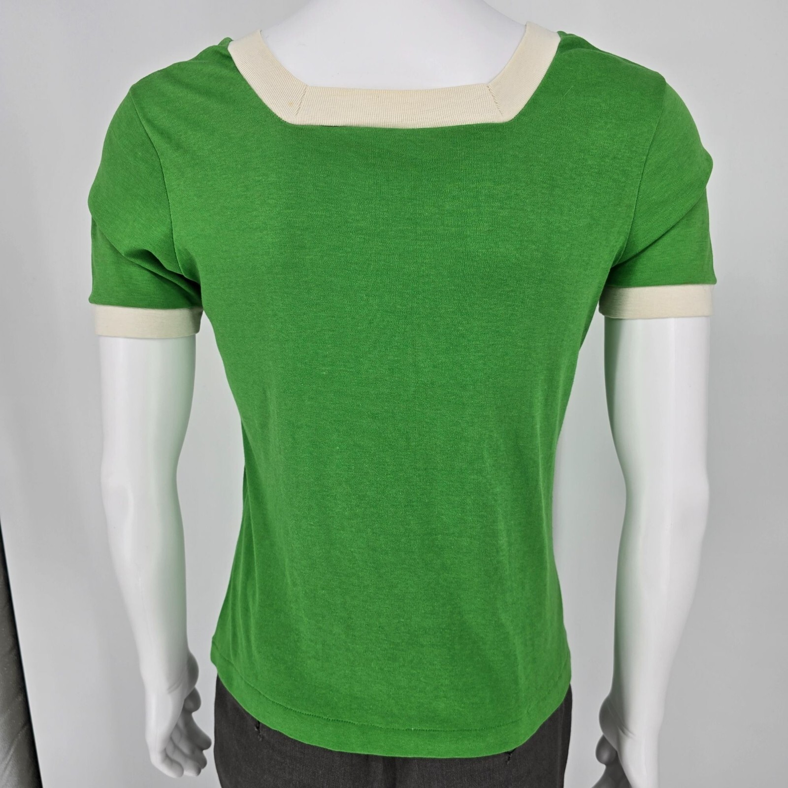 ๐น Item Details: Brand: Sears Material: Unknown (tag illegible- feels like 50/50 cotton/poly blend) Color: Green Decade of Manufacture: 1970s Country of Manufacture: Unknown (but almost certainly United States) Notable Features: Square crew neckline, contrast collar and cuffs, single stitch hem ๐น Condition Notes: Good used vintage condition. Discoloration at collar and at both cuffs. Moderate fabric wear, fading, and pilling throughout. See photos. ๐น Size Notes: Vintage Tag Size: Unknown (tag illegible) Modern Measured Size: Small ๐น Measurements (Approximate): Chest (pit to pit): 35.5 inches Collar to Hem: 24.5 inches ๐น Shipping & Returns: Ships worldwide from Lexington, KY. Ships within 3 business days of purchase. Returns accepted within 60 days for domestic orders and 30 days for international orders.