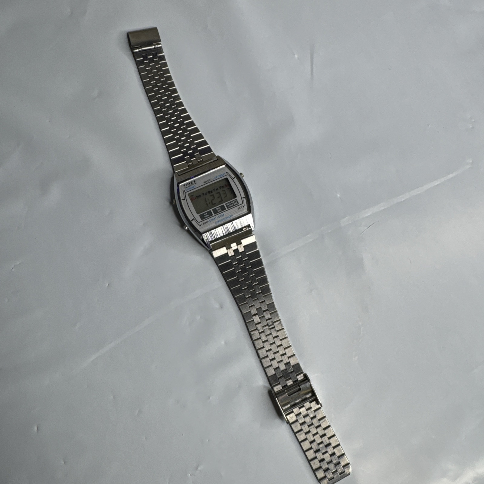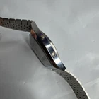 The Vintage Timex Quartz F Cell Chronograph Digital Wristwatch is a classic timepiece from the early 1970s designed for men. It features a silver metal bracelet strap and case, with a digital display and quartz movement. This Timex watch includes chronograph features, making it a functional and stylish accessory for everyday wear. The watch is in good running condition, adding to its appeal for collectors or those looking for a vintage timepiece with modern functionality.