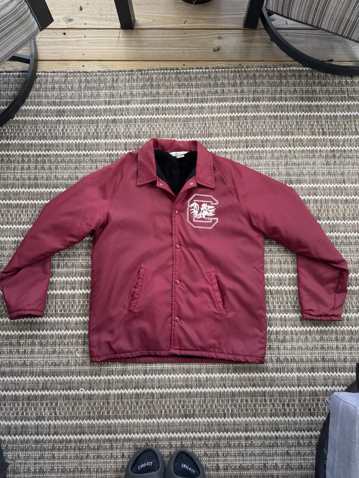 in great condition, no stains or rips ! comes with the black furr insides. no back graphic but you do have the logo on the heart ! length is 29 & width is 24 The product is a vintage 1970's ChalkLine USC Gamecocks bomber jacket in size L. It is an officially licensed NCAA football jacket in red, designed for men. The jacket features the South Carolina Gamecocks team logo and is made in the United States. It is a collectible piece for fans of the team looking for retro sports apparel.