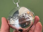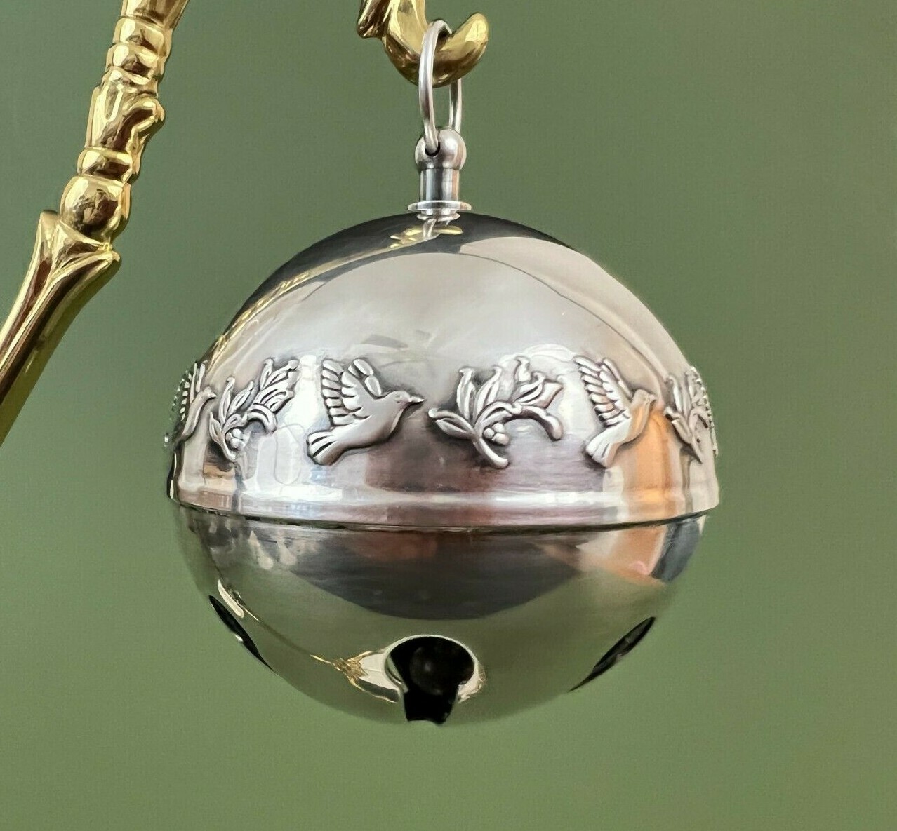 Vintage Wallace 1977 Silver Plate Sleigh Bell Ornament, embossed Mistletoe and Doves pattern. Has '1977 Wallace' marked at the bottom. Lovely! Holder is not included. Excellent vintage condition with no issues. Light signs of age/wears. Please see photos for detail. Measurements: ~ 2 3/4''H x 2 1/2'' diameter