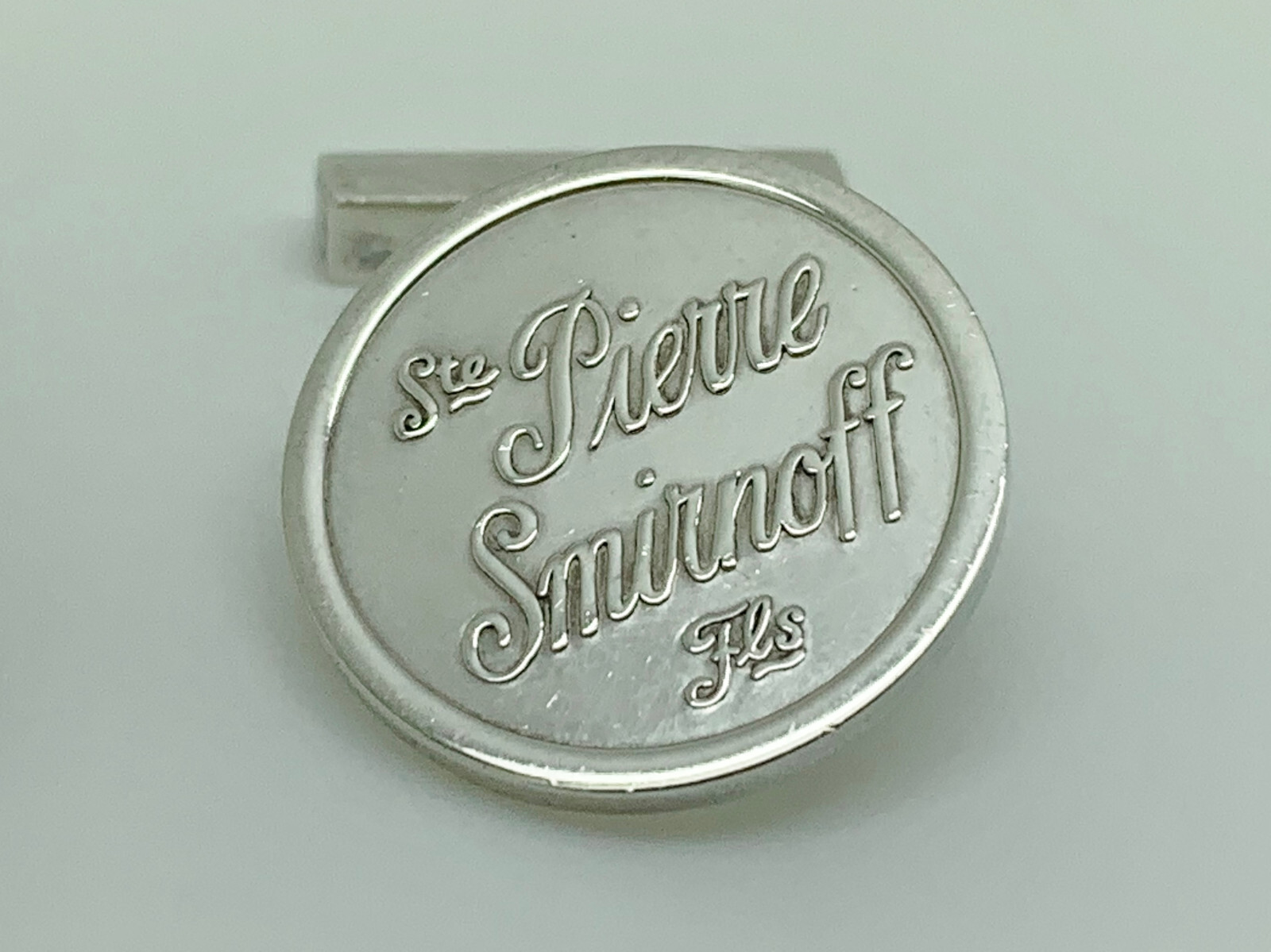 A superb pair of vintage (hallmarked for 1978) sterling silver cufflinks, the design reads Ste Pierre Smirnoff - this is what Smirnoff vodka was branded as in its early days. Probably produced to commemorate an anniversary, nice pieces of breweriana memorabilia. Nice quality weight. Maker/Markings: Marked with english hallmarks - SS, Lion Passant, Leopards Head, Date Letter D for 1978 Condition: Very Good Used Condition, general wear to the silver - Please look at photos Measurements: Face of Cufflink 20mm ~ 3/4" Weight: 14g Combined Shipping on all items SC5667-4 Vintage 1978 English Sterling Silver Ste Pierre Smirnoff (Vodka) Cufflinks