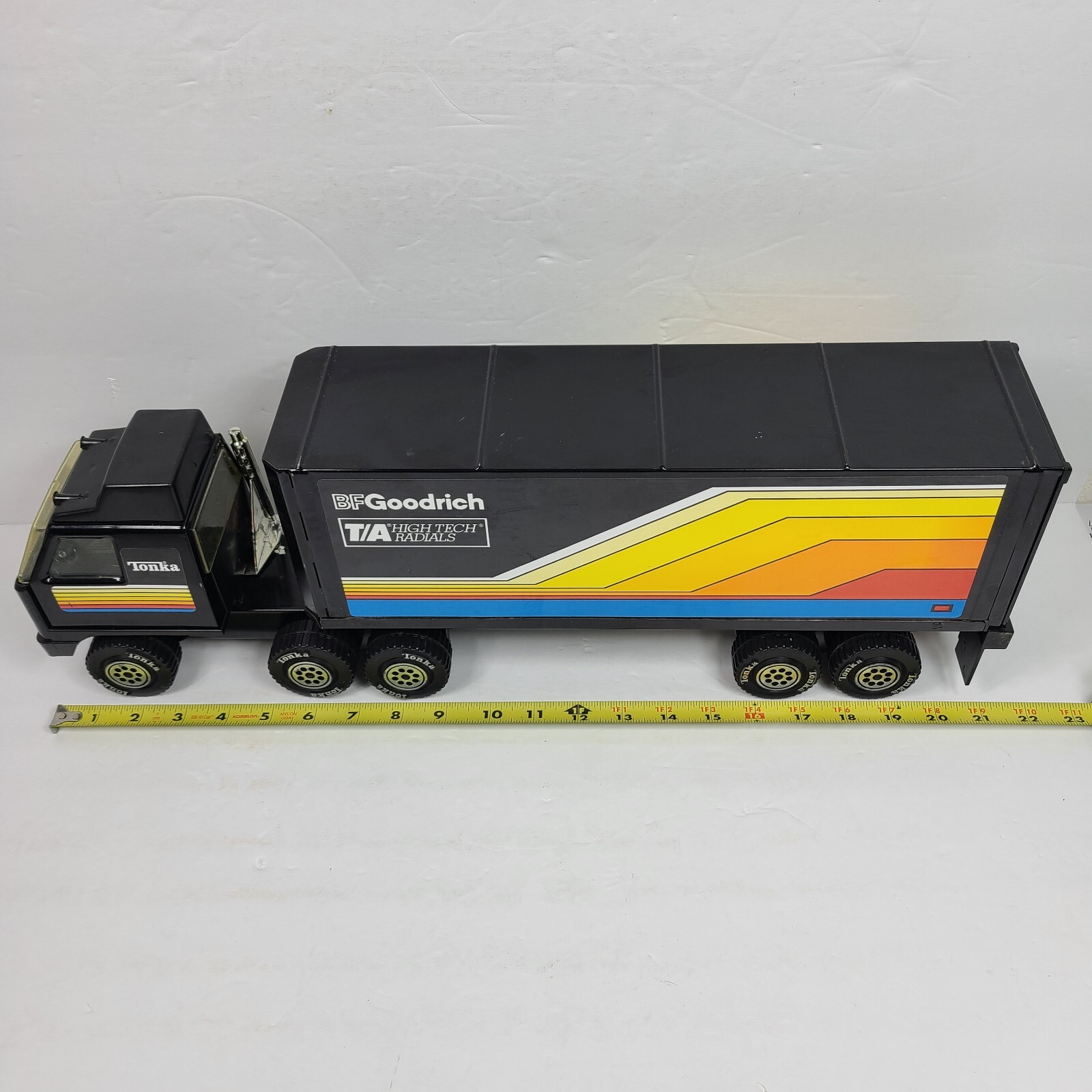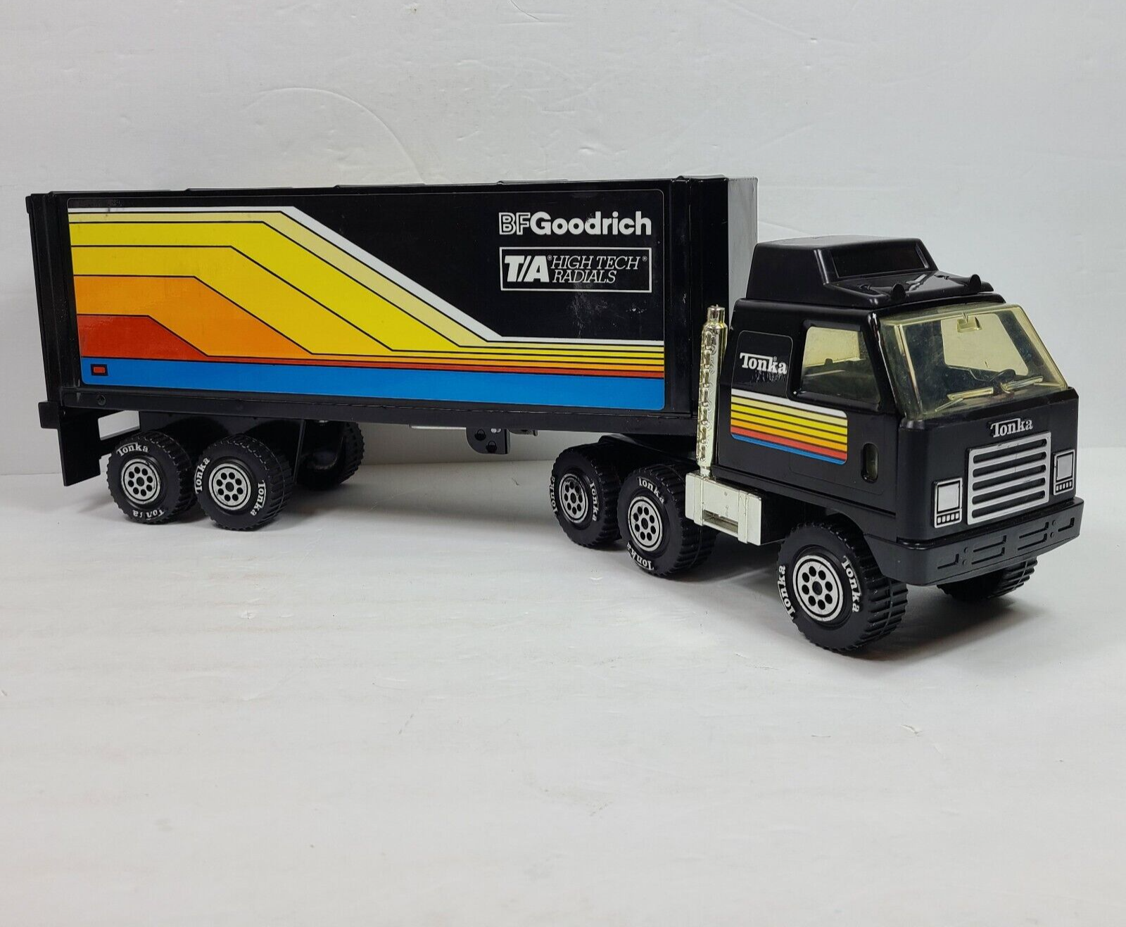 Vintage 1978 TONKA Black Semi Truck and Trailer BF Goodrich Radial T/A's - Toy Is In EXCELLENT Condition (see detailed pictures) No Smoke or Pet Odors This Is a Large Truck, Approx. 22.5" Overall Length Ships FAST with USPS, UPS or Fed Ex Thank You For Visiting Our eBay Store- Check Out Our other Great Items!