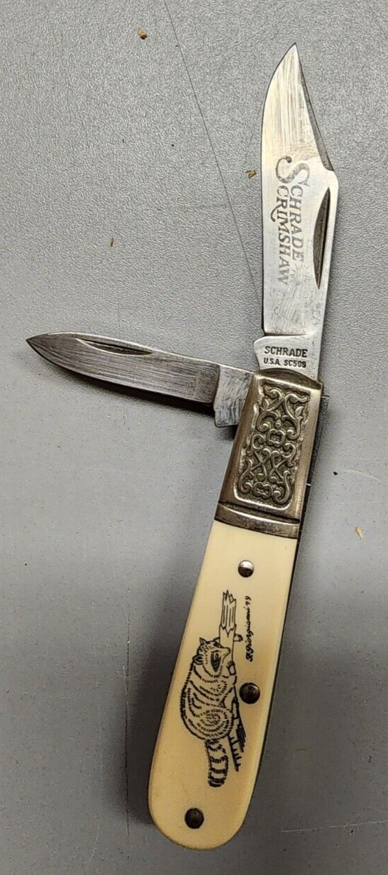 Vintage 1979 Schrade Scrimshaw Raccoon Barlow Knife SC506 USA Made with Sheath