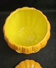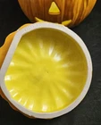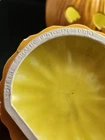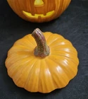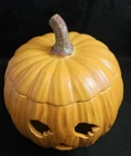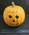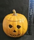 VINTAGE 1980 CERAMIC PUMPKIN HALLOWEEN JACK O LANTERN Candle Holder 7” Tall EUC. Love how the texture looks like a real pumpkin and the yellow glazed interior reflects the light nicely. It is in excellent condition with a few small flea bites/chips on the underside of the lid/top. Please see pictures for details and measurements as they are part of the description.